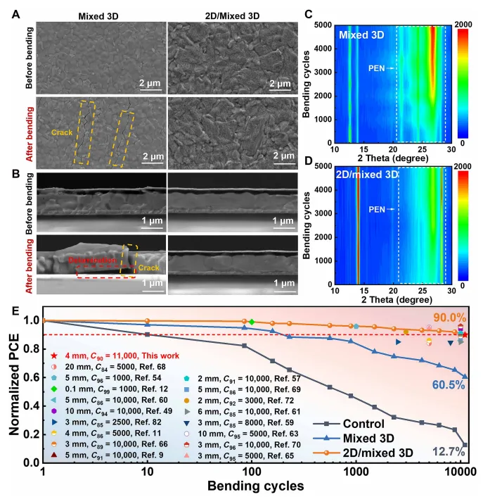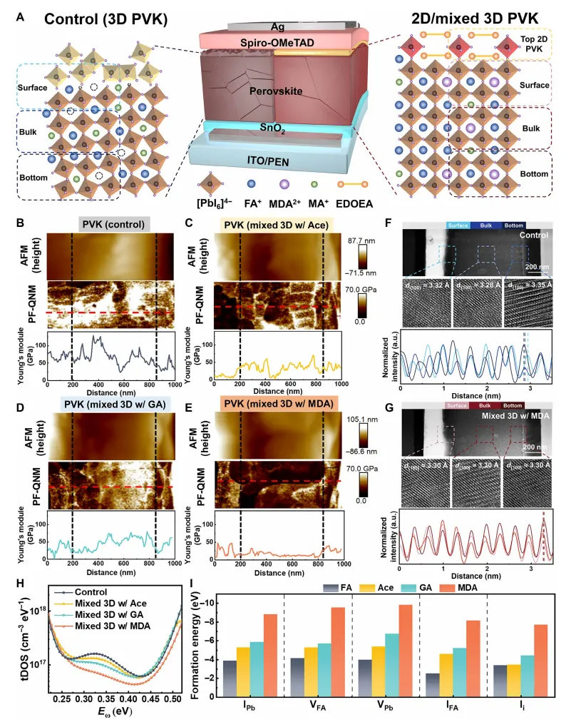 采用两步沉积法制备钙钛矿薄膜,将3mol%的MDA²⁺掺入PbI₂前驱体溶液中,调控晶格微应变与组分均匀性;在MDA掺杂的3D钙钛矿表面旋涂5mg/mL的EDOEA异丙醇溶液,100℃退火5分钟,原位反应生成垂直取向的DJ型2D钙钛矿钝化层;柔性器件以PEN/ITO为基底,低温退火制备各功能层,刚性器件以玻璃/ITO为基底,完成n-i-p结构器件制备。