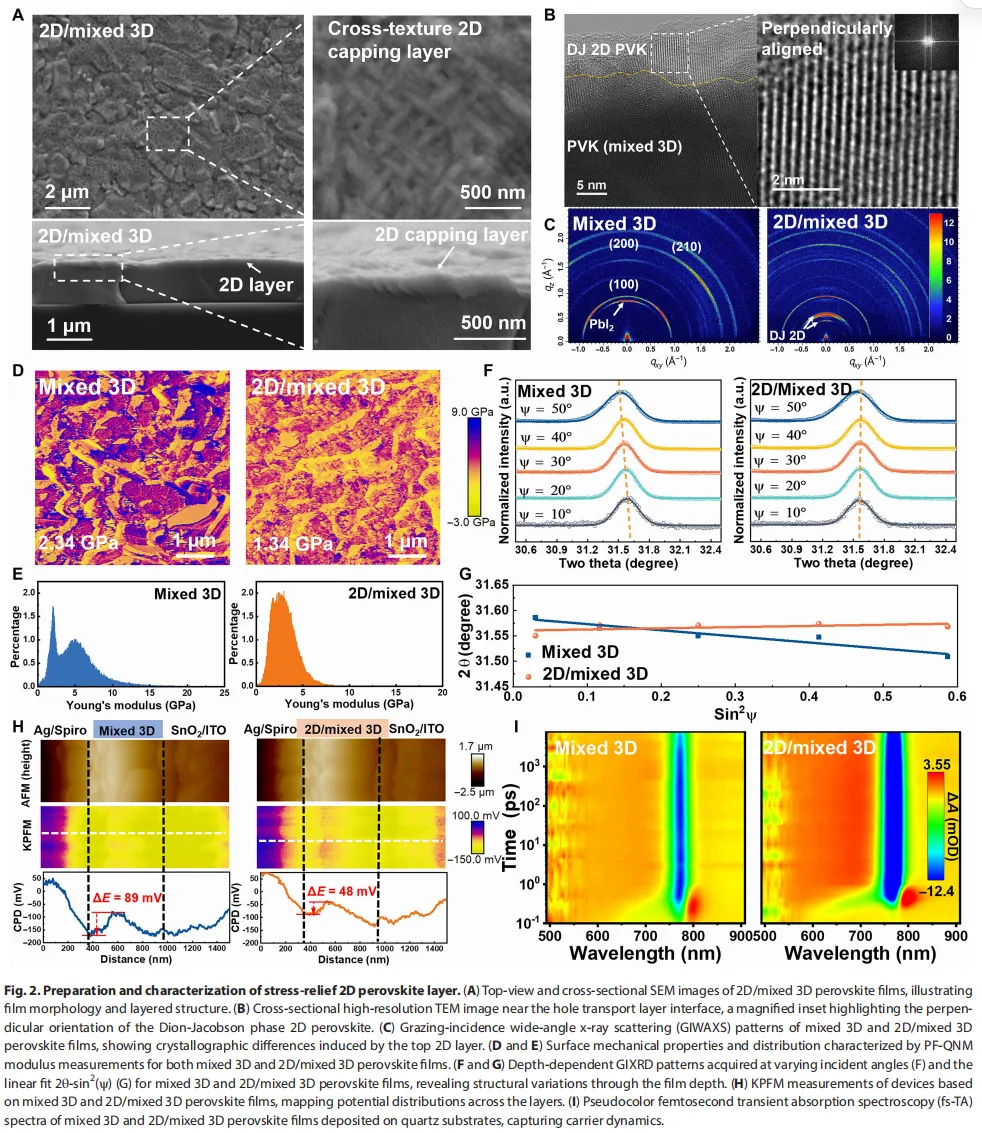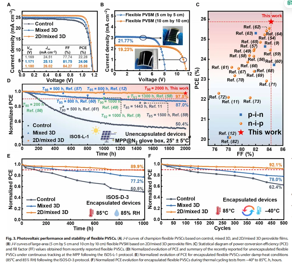该研究通过优化A位MDA²⁺掺杂均化面外应变分布,并在富PbI₂表面原位生成垂直取向DJ型2D钙钛矿层释放残余应力、提升界面载流子传输与力学性能,刚性器件冠军效率达26.59%,柔性器件冠军效率达25.88%(认证25.55%),大面积柔性模组分别获得21.77%(25平方厘米)和19.23%(100平方厘米),未封装器件2000小时最大功率点跟踪后保留97.8%初始效率。