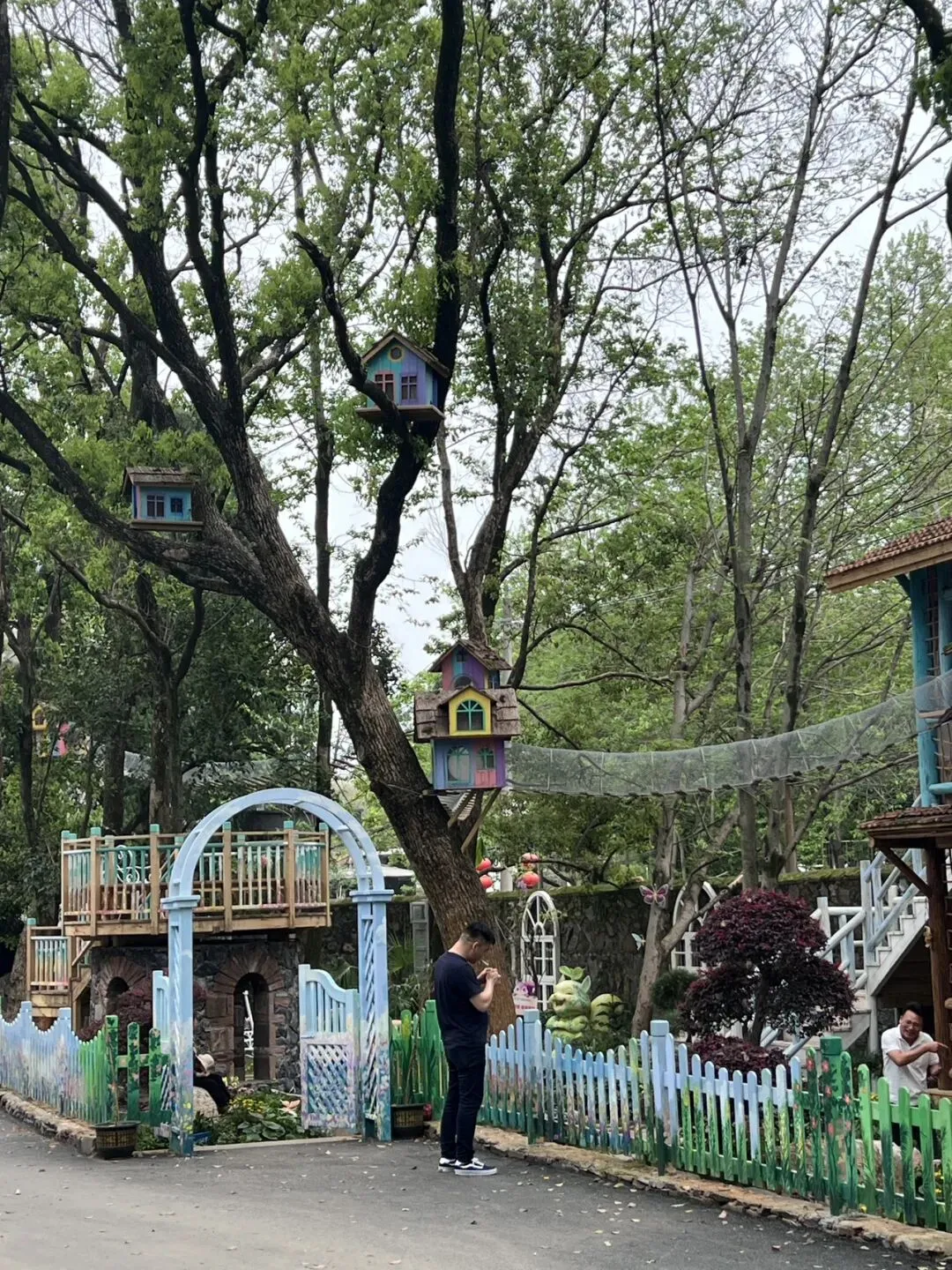 淡蓝梦幻拱门拉开序幕,马卡龙手绘围栏温柔治愈,参天古树上错落悬挂彩色小屋,