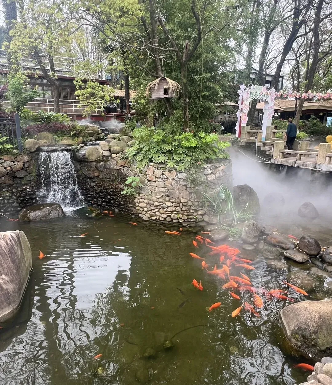 园内溪水潺潺、叠石成瀑,一池锦鲤悠然游动,林间水雾袅袅,灯笼错落点缀,