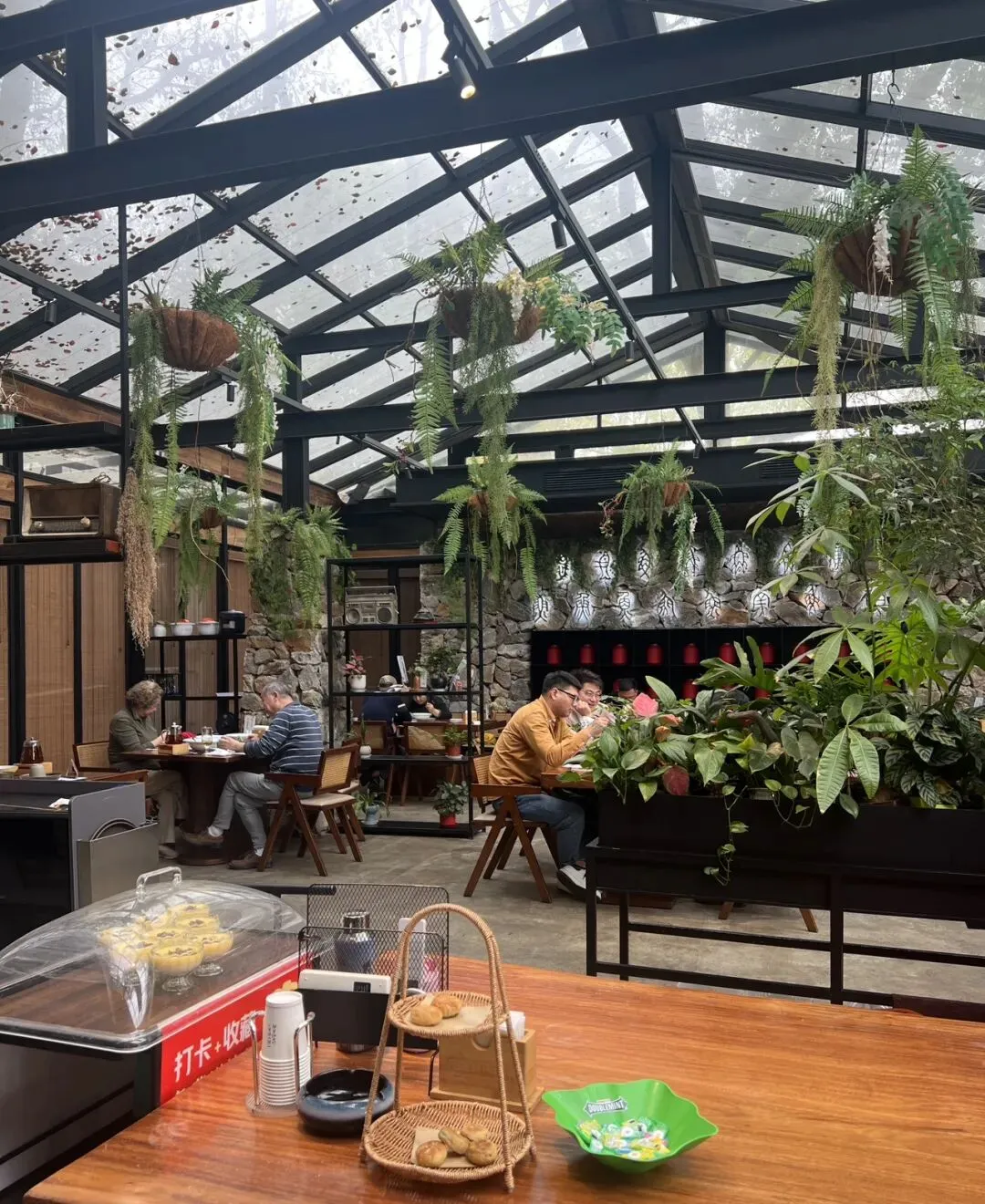 全景玻璃阳光餐厅通透雅致,满室绿植环绕,山野风光尽收眼底。