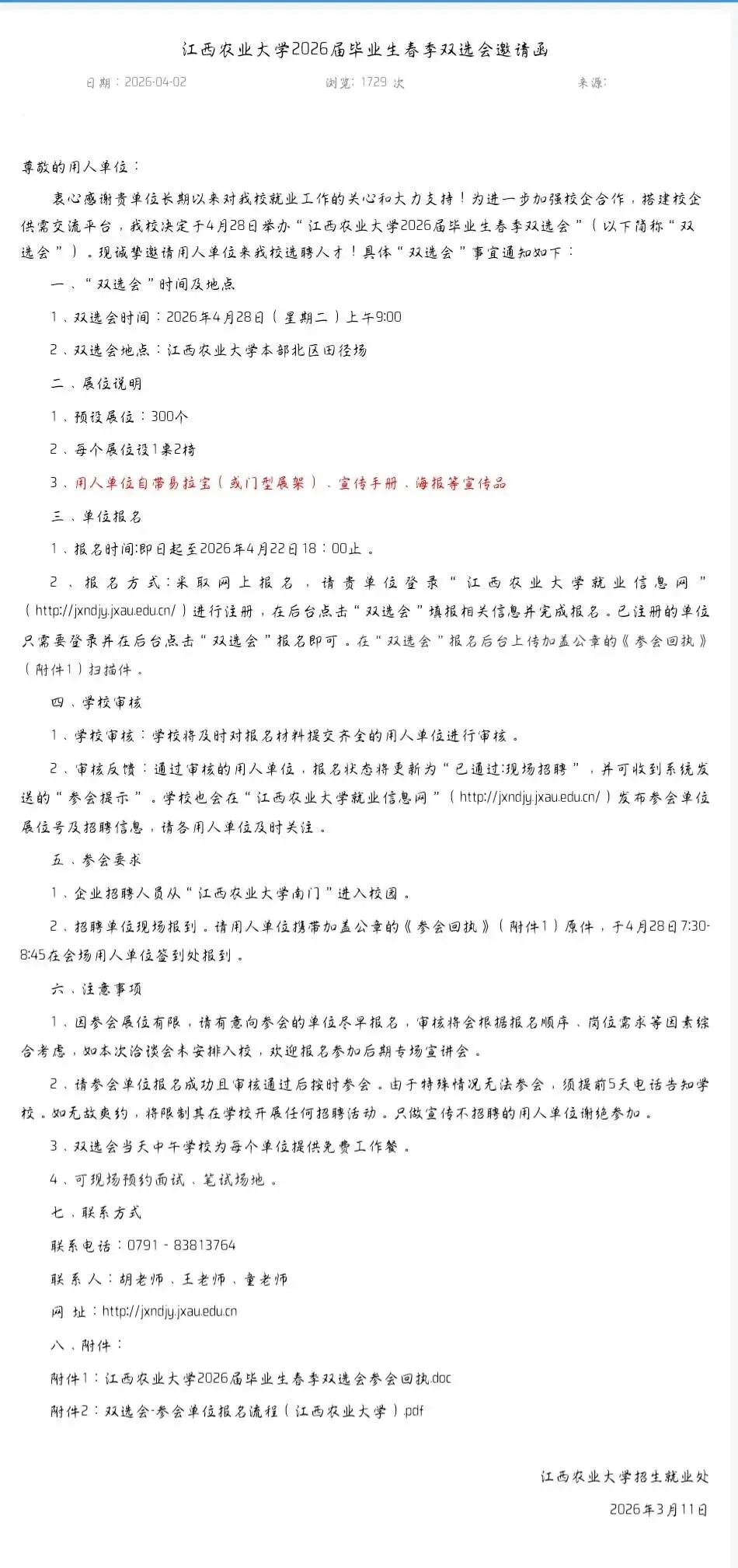 刚刚刷到最新情报:江西农业大学2026届毕业生春季双选会定档了!