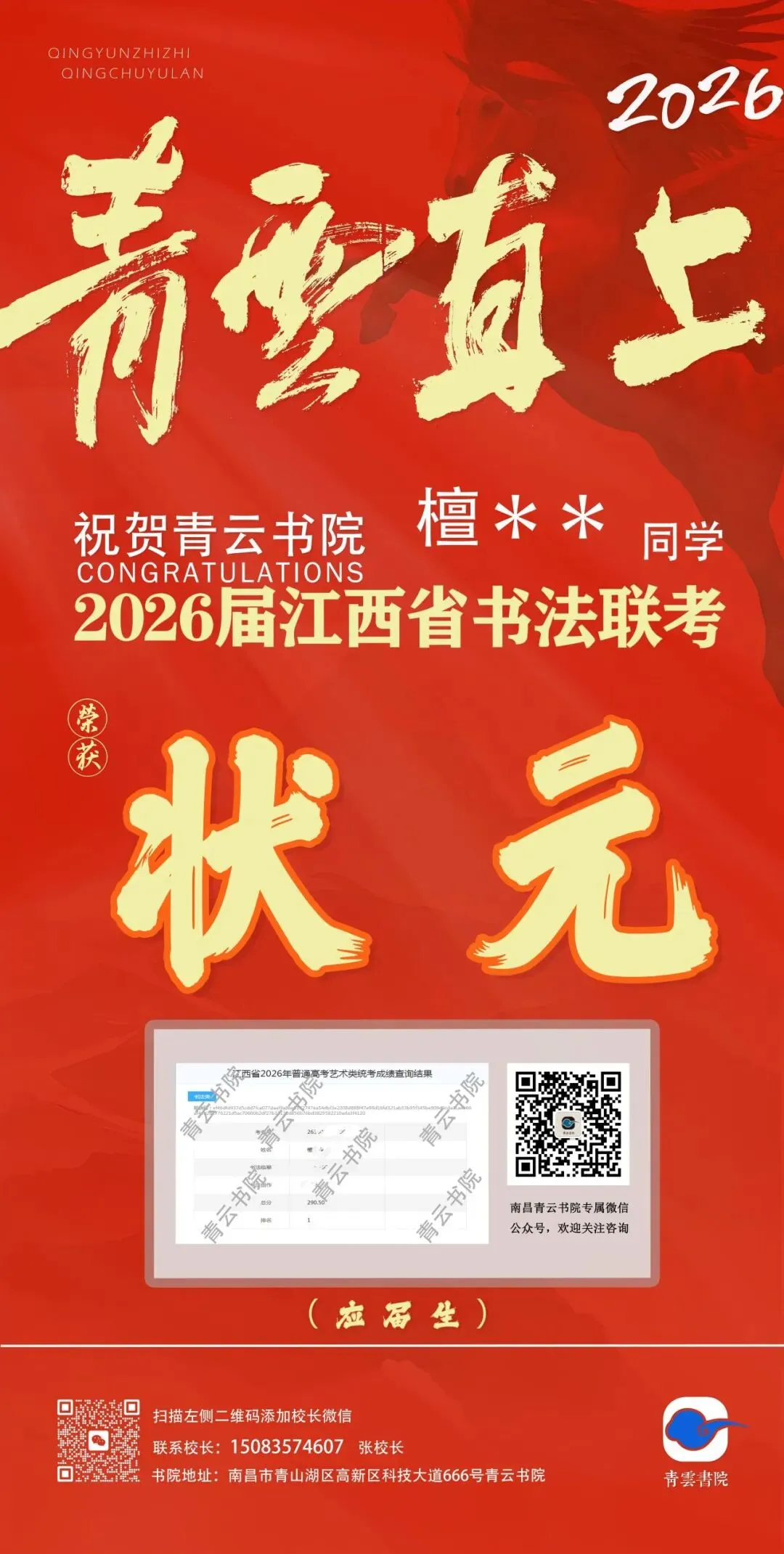 肖青林,毕业于河北美术学院,书法专业,从业4年。2026届带领学生斩获13名,前300名12人,低进高出,班级专业过线率超50%。