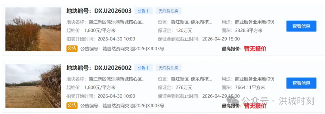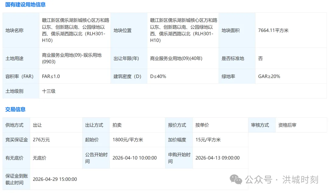 近日,江西省公共资源交易平台自然资源网上交易系统上线了2宗位于赣江新区的商业服务业用地,地块将于2026年4月30日拍卖。从地块信息看,DXJJ2026003地块位于赣江新区儒乐湖新城核心区万和路以东、创新路以南、公园绿地以西、儒乐湖西路以北(RLH301-H10),地块面积7664.11平方米,土地用途为商业服务业用地、娱乐用地,地块容积率1.0,建筑密度40%,绿地率20%。