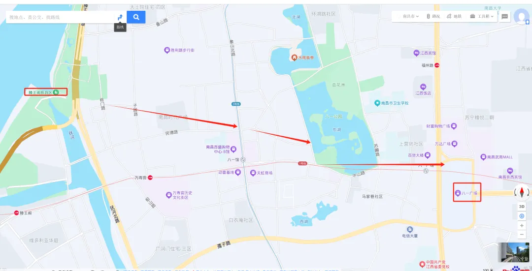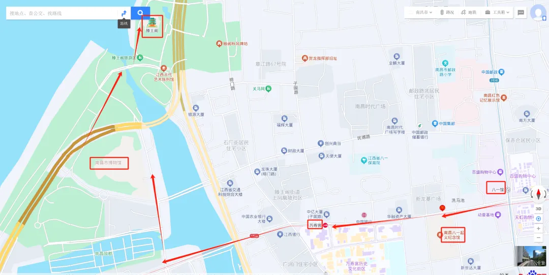 我写这个日期,是因为这是我刚来南昌时的第一个周末。去年的12月6号,当时初来南昌,就自己顺着地图,一路逛下来的记录。今天写公众号文章,就想把当时的游玩情况记录一下,给大家分享。 我是从新建区做232公交车到八一馆附近,然后下来走路到八一纪念馆。这里说明一下:我之前在一些短视频上看到的南昌打卡处,有一个很大的建筑背景,和人民大会堂似的,我原以为就是八一馆的,所以就直接坐车到的八一馆,然后八一馆逛完了,也没看到那个大的建筑,后来一查询,发现那是八一广场。【八一纪念馆】:里面是对当时南昌起义的史料记载,对历史感兴趣的同学可以认真看一下。 八一纪念馆逛完之后,沿着路线图,到了【万寿宫】,万寿宫其实可以认为是吃货的一片天地,里面各种小吃,应有尽有,简直是吃货的天堂。不过本人不敢兴趣,也没拍照,大致看了一下,和南京的老门东很像,但是没老门东那种风景之气,这里商业气息过于浓重。 过了万寿宫,来到了【南昌市图书馆】,这个建筑外观看着很气派,打卡好背景。 过了南昌市图书馆,沿着江边,到了【滕王阁】,滕王阁需要门票,这个门票其实是进入滕王阁的小范围之内,并可进入塔内。门票价格:50元。其实在外面也可看清楚整个滕王阁的全貌,也可以到塔下面拍照打卡; 在塔的后面,靠近江边有一条路,是免费进入的,可以路过塔底,在下面打卡拍照,这样可以省一张门票费用。 在滕王阁后面,靠近江边栏杆,眺望江的对面,建筑高耸林立,看着很像一个现代化大都市: 看完滕王阁,我就想到八一广场看一下,当时想着也就两三公里的路程,然后就走过去了,顺便看一看街边的风土人情。不过要是不经常走路的小伙伴,还是老老实实的坐车过去,有公交,不远处地铁也可到达。 路上顺便逛了一下【八一公园】,公园不错,水体很大,湖边钓鱼的人还不少。 【八一广场】:广场很大,纪念碑塔老远就能看到,同时类似人民大会堂的建筑也终于看到。看到过八一广场的短视频介绍,好多人在出来地铁时,会慢慢的拍照,建筑一点一点扩大,拍照效果很好。 这个类似人民大会堂的建筑,其实是【江西省美术馆】,以前总以为是某个政府机构的。片尾:我这一天走下来,还蛮废腿的,建议不经常走路的小伙伴,尽量坐车出行。创作不易,感谢关注,后面会有更加精彩的分享,谢谢!