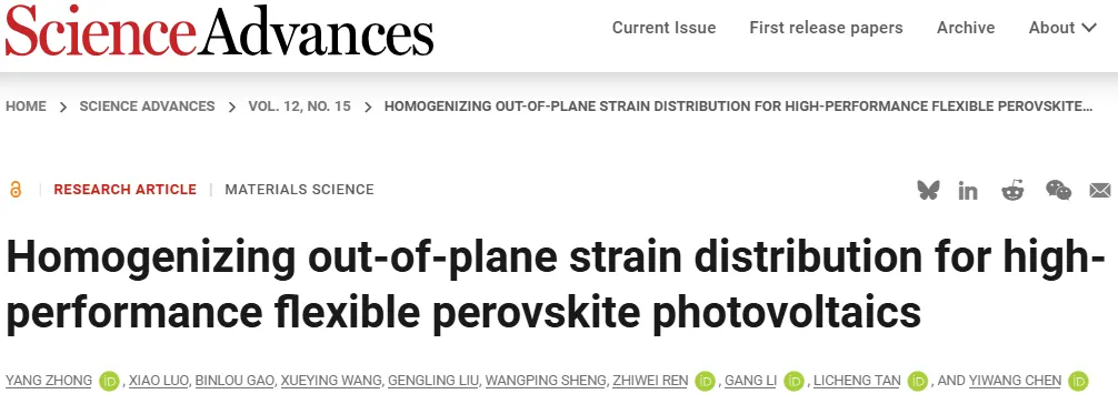 Yang Zhong et al. ,Homogenizing out-of-plane strain distribution for high-performance flexible perovskite photovoltaics. Sci. Adv. 12,eaec3238(2026). DOI:10.1126/sciadv.aec3238
