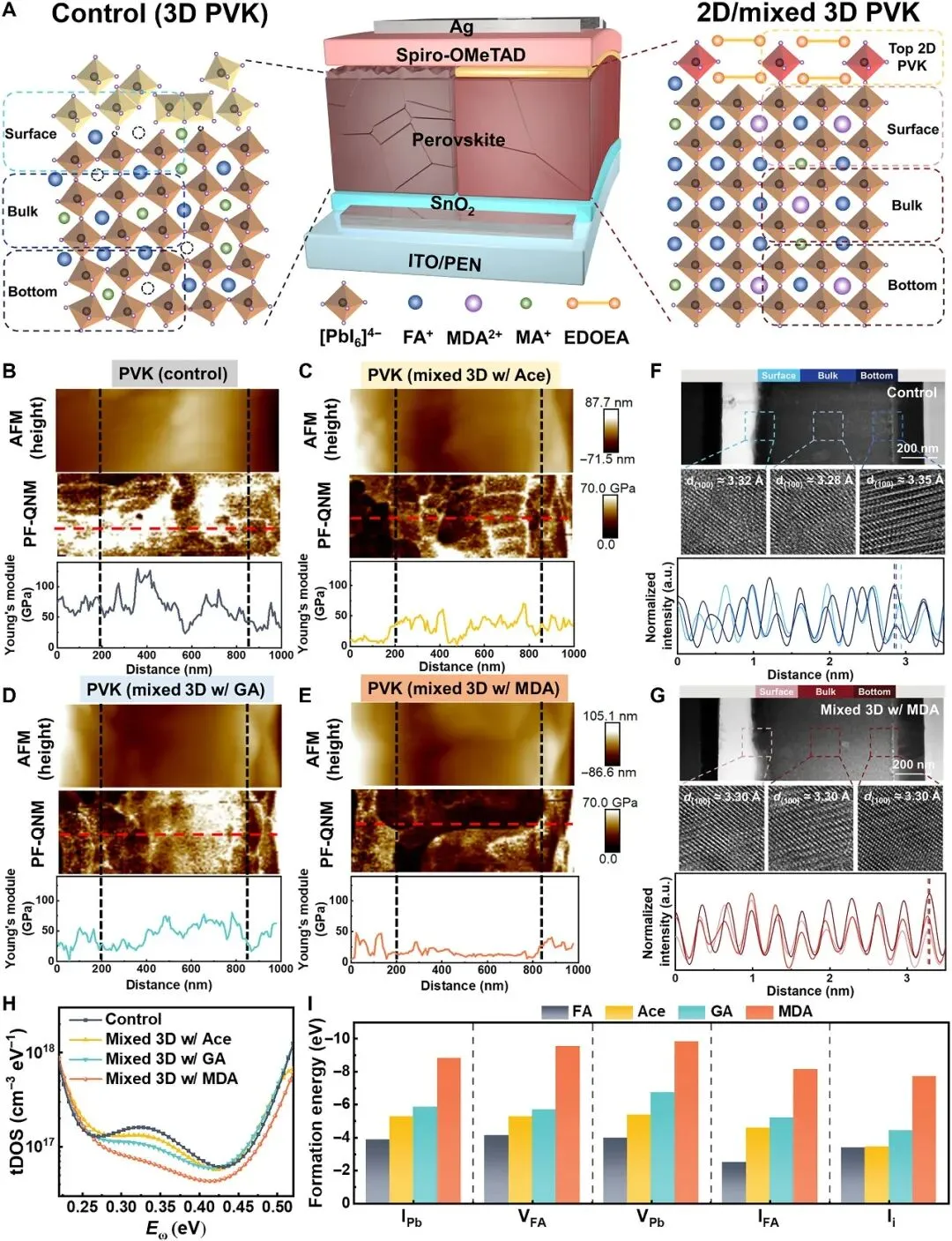 (A) 通过 A 位阳离子合金化及顶部二维钙钛矿层包覆实现应变均质化机制的示意图。(B–E) 钙钛矿器件的纳米力学分布图:(上)原子力显微镜(AFM)形貌图,(中)峰值力定量纳米力学图谱(PF-QNM)模量图像,(下)对比对照组与不同 A 位混合阳离子钙钛矿薄膜的杨氏模量差异曲线。(F、G) 原子尺度应变分析:(上)ITO/SnO₂/ 钙钛矿 / Spiro-OMeTAD/Ag/Pt 叠层结构的高角环形暗场扫描透射电镜截面图,(中)原子分辨率透射电镜图像(标尺 7.8 nm)及实测晶面间距,(下)用于量化晶格畸变的对应强度线扫曲线。(H) 基于对照组与不同阳离子掺杂钙钛矿薄膜的器件,由热导纳光谱拟合得到的缺陷态密度(tDOS)曲线,其中 Eω 为对应频率响应的特征能量。(I) 不同阳离子掺杂钙钛矿中各类缺陷的形成能计算,重点关注负电缺陷,包括碘 - 铅反位缺陷(I_Pb)、甲脒空位(V_FA)、铅空位(V_Pb)、碘 - 甲脒反位缺陷(I_FA)及碘间隙缺陷(I_i)。