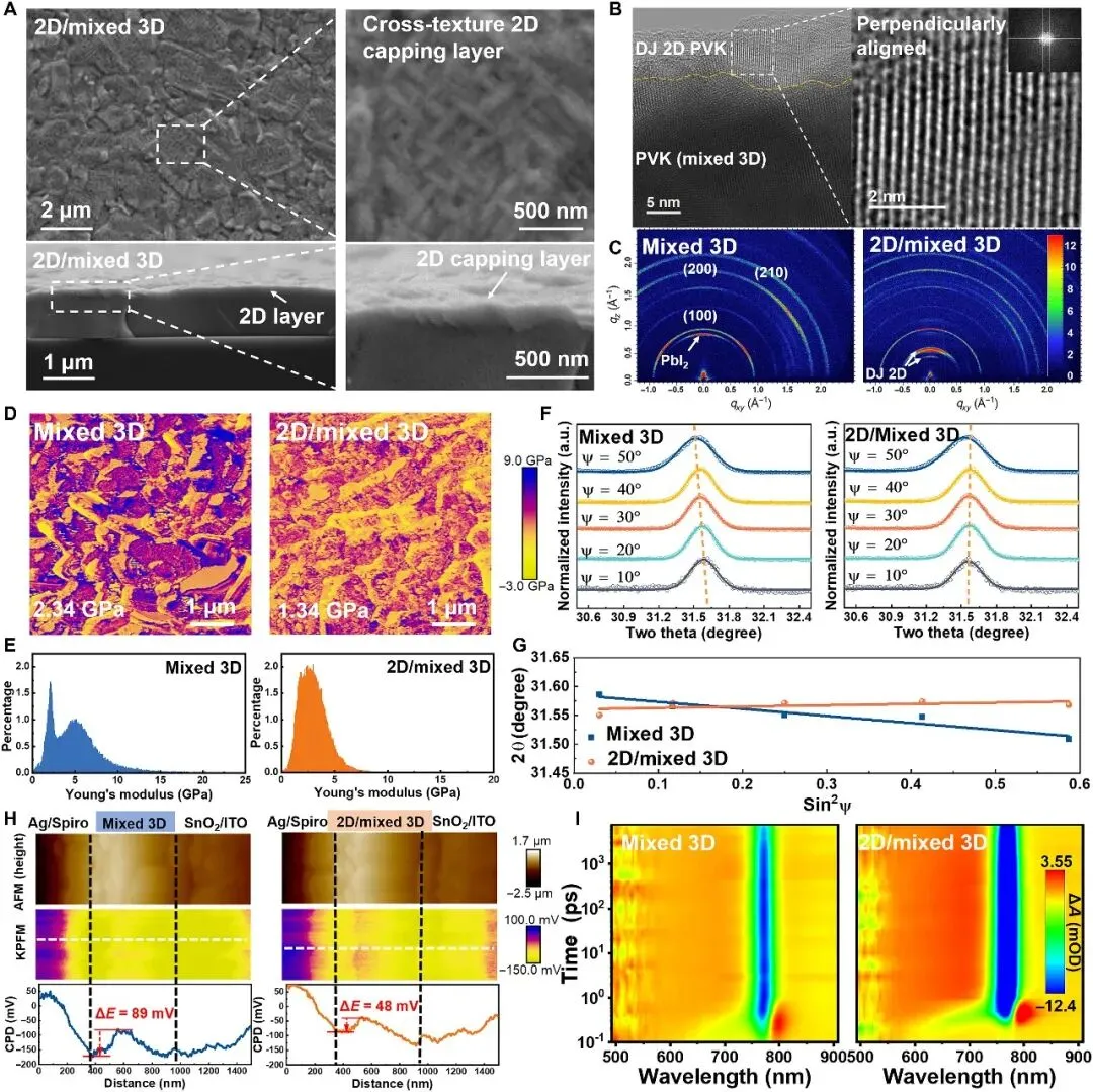 (A) 二维 / 混合三维钙钛矿薄膜的俯视及截面扫描电子显微镜(SEM)图像,展示了薄膜形貌与层状结构。(B) 空穴传输层界面附近的截面高分辨透射电子显微镜(TEM)图像,插图放大区域突出显示了 Dion-Jacobson 相二维钙钛矿的垂直取向。(C) 混合三维钙钛矿与二维 / 混合三维钙钛矿薄膜的掠入射广角 X 射线散射(GIWAXS)图谱,体现了顶部二维层带来的晶体结构差异。(D)、(E) 采用峰值力定量纳米力学图谱(PF-QNM)模量表征的混合三维与二维 / 混合三维钙钛矿薄膜的表面力学性能及分布。(F)、(G) 不同入射角下获得的随深度变化的掠入射 X 射线衍射(GIXRD)图谱(F),以及混合三维与二维 / 混合三维钙钛矿薄膜的 2θ–sin²ψ 线性拟合曲线(G),揭示了薄膜沿深度方向的结构变化。(H) 基于混合三维与二维 / 混合三维钙钛矿薄膜的器件的开尔文探针力显微镜(KPFM)测试,表征了各层间的电势分布。(I) 沉积在石英基底上的混合三维与二维 / 混合三维钙钛矿薄膜的飞秒瞬态吸收(fs-TA)伪彩色光谱,捕获了载流子动力学过程。
