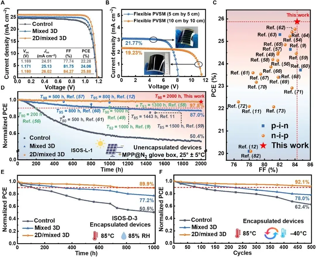 (A) 基于对照组、混合三维钙钛矿薄膜及二维 / 混合三维钙钛矿薄膜的最优柔性钙钛矿太阳能电池的电流 - 电压(J-V)曲线。(B) 基于二维 / 混合三维钙钛矿薄膜的大面积(5 cm×5 cm 及 10 cm×10 cm)柔性钙钛矿太阳能模组的 J-V 曲线。(C) 近期已报道柔性钙钛矿太阳能电池的光电转换效率(PCE)与填充因子(FF)数据统计图。(D) 按照 ISOS-L-1 标准,在最大功率点持续追踪条件下,未封装柔性钙钛矿太阳能电池的归一化光电转换效率衰减曲线,及近期相关文献结果汇总。(E) 按照 ISOS-D-3 标准,在湿热环境(85℃、85% 相对湿度)下,封装柔性钙钛矿太阳能电池的归一化光电转换效率变化曲线。(F) 在 −40℃ 至 85℃ 冷热循环测试中,封装柔性钙钛矿太阳能电池的归一化光电转换效率变化曲线。