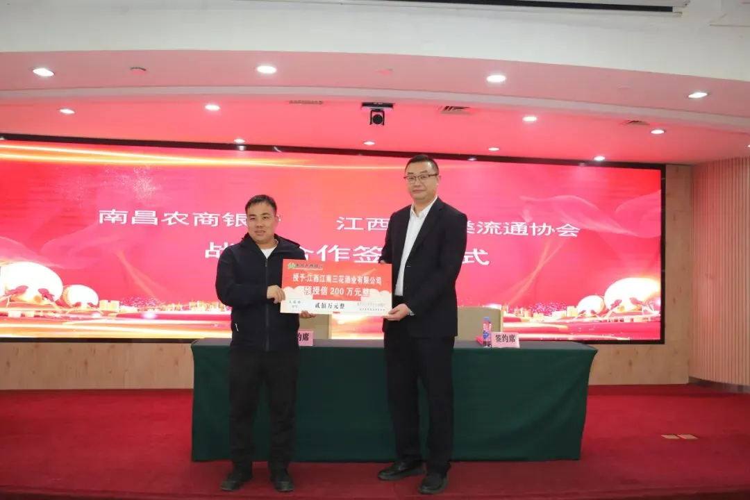 为推动合作快速落地见效,现场还举行了首批贷款意向企业授牌环节。三花酒业、瓦恩贸易、酒旗名酒商行3家企业与南昌农商银行城西支行成功签订银企预授信协议。