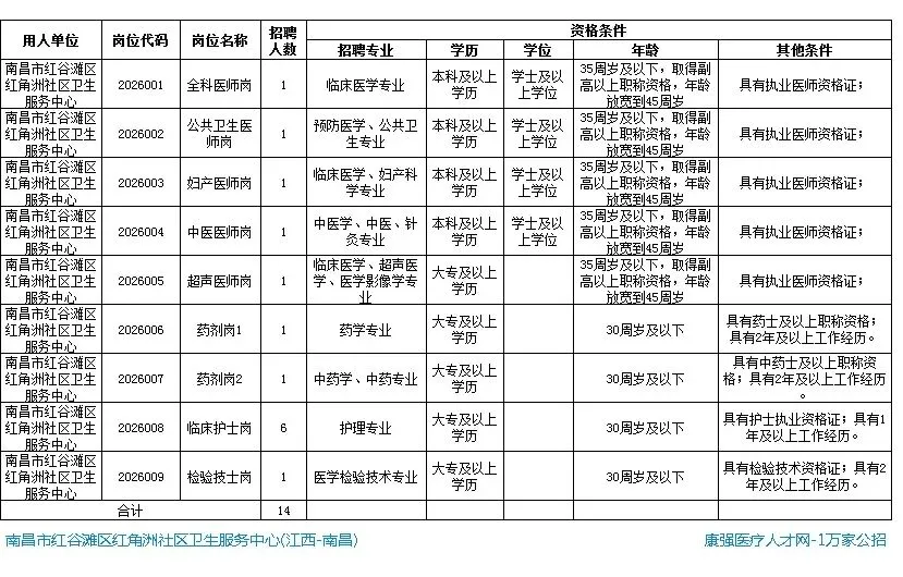 1:南昌市红谷滩区红角洲社区卫生服务中心2026年招聘岗位表