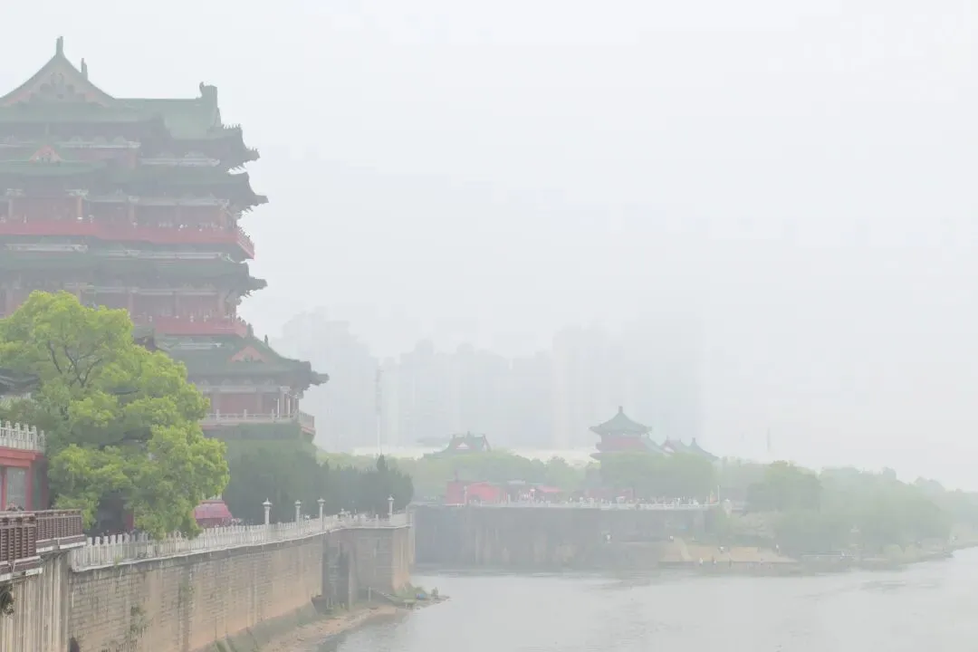 剩余的时间,去了滕王阁,但因为只记得《滕王阁序》的开头和结尾,所以也没有登楼,只在楼下拍了张游客照。倒是在江边散步的时候,遇见了一位大爷,在禁止垂钓和禁止翻越的警示牌旁边,公然翻到了栏杆外面垂钓,有种什么都不在乎的洒脱。高中的时候还可以熟练地背诵《滕王阁序》,甚至在背到“屈贾谊于长沙,非无圣主;窜梁鸿于海曲,岂乏明时”的时候,还会热泪盈眶;如今只能看着雾中的滕王阁,念一句“阁中帝子今何在,槛外长江空自流”。