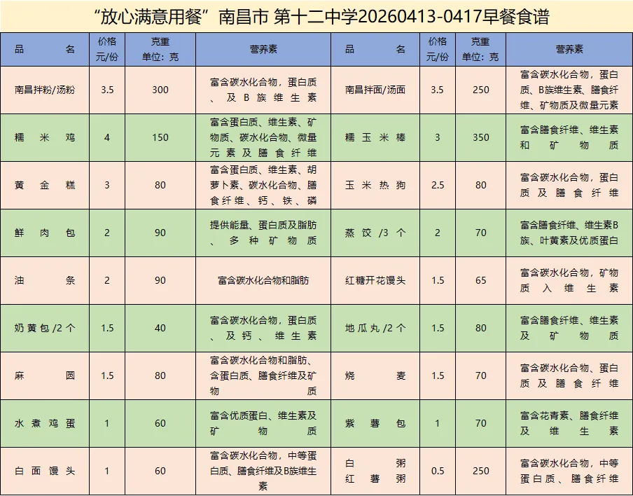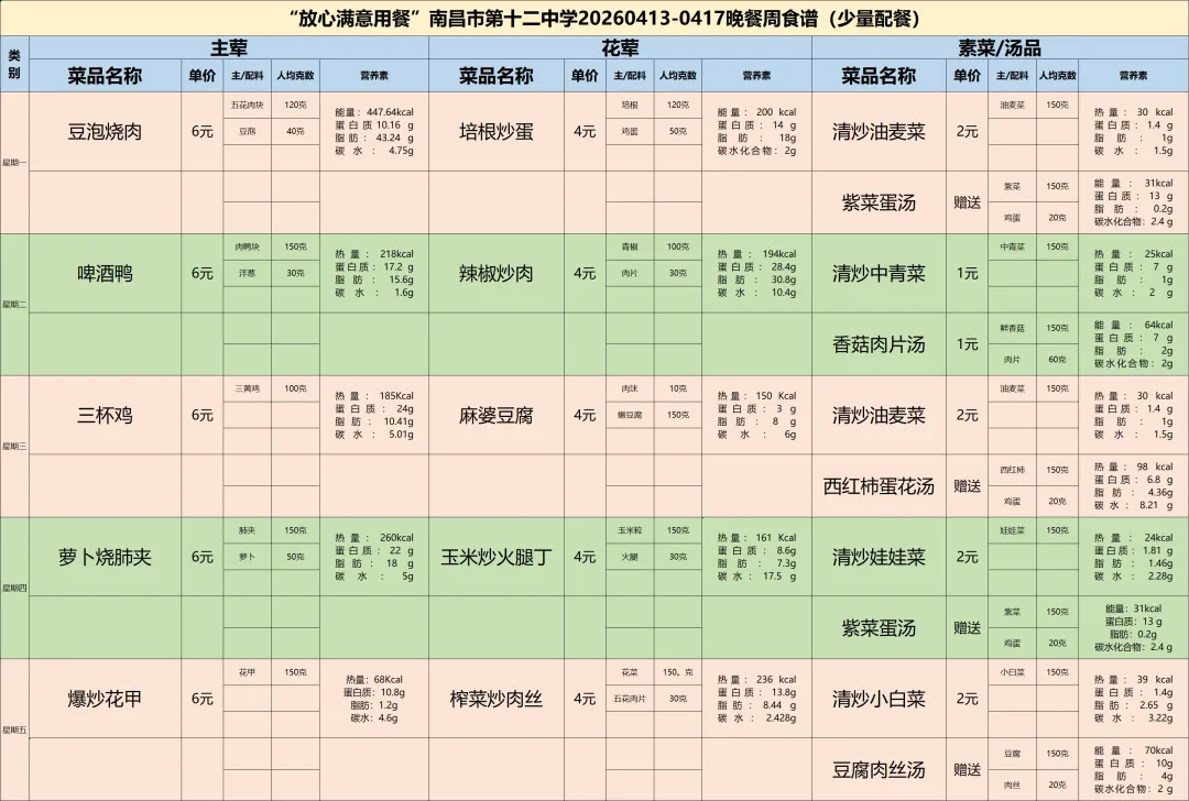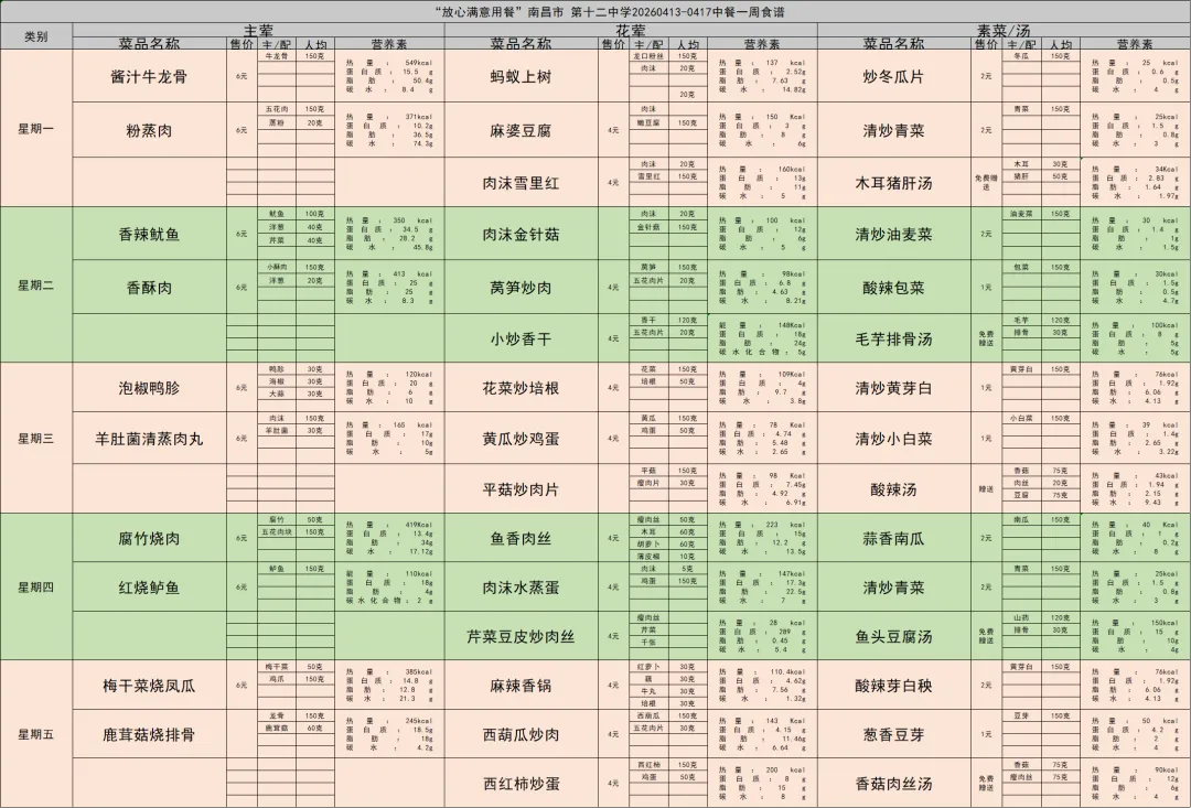南昌市第十二中学食堂周营养食谱(4月13日—4月17日)
