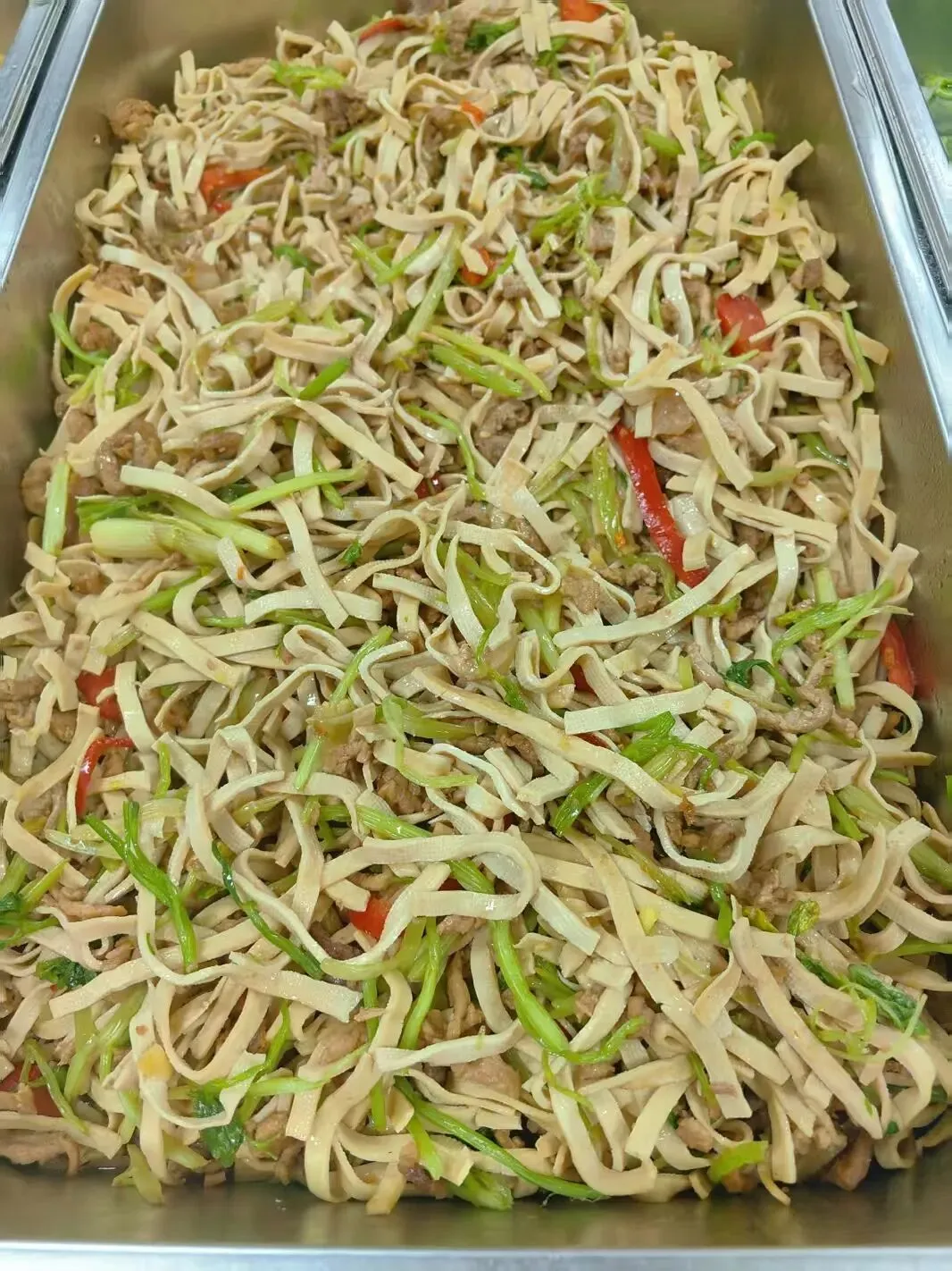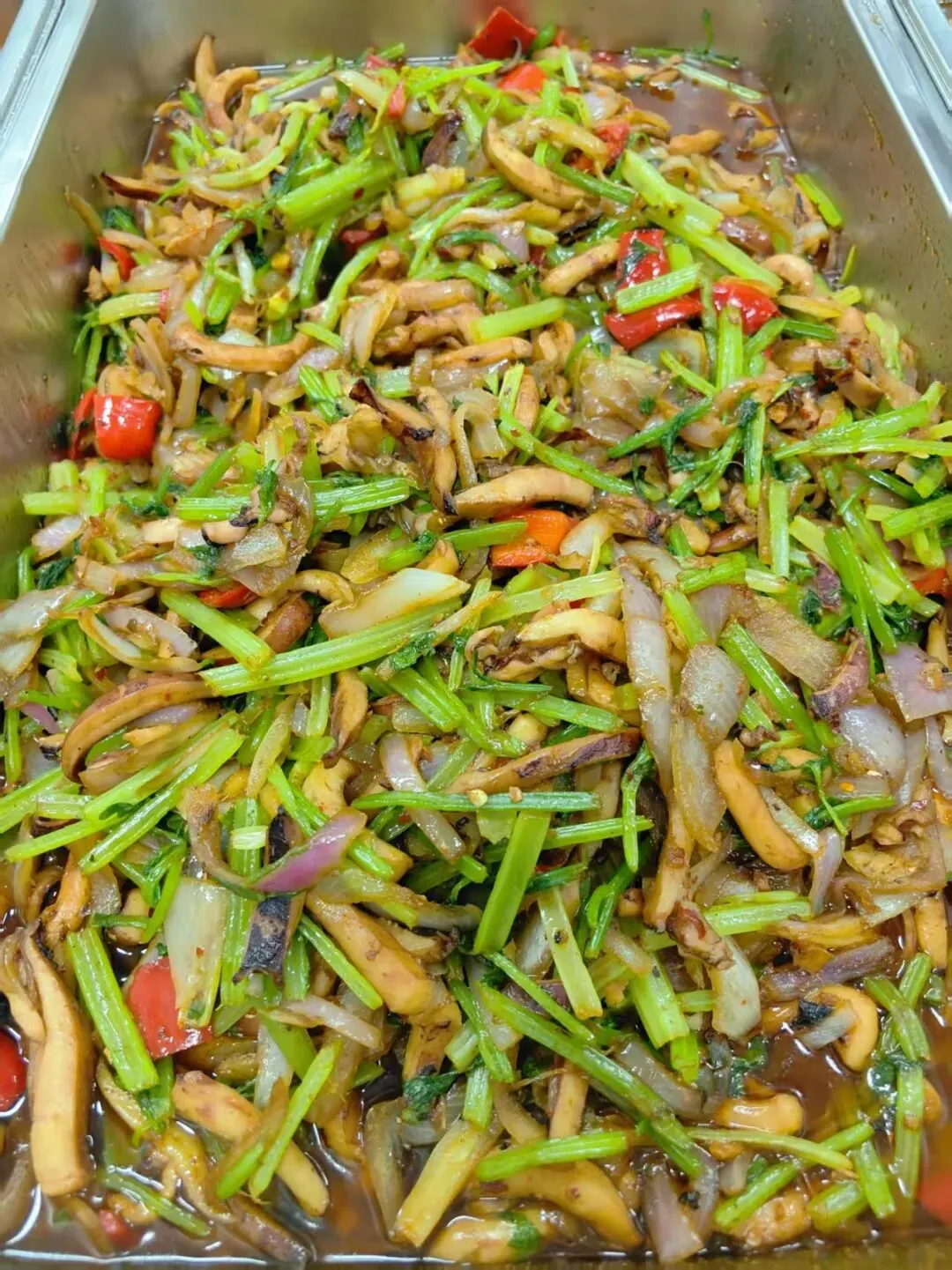 香辣鱿鱼,香酥肉,肉沫金针菇,莴笋炒肉片,小炒香干,清炒油麦菜,酸辣包菜,毛芋排骨汤。
