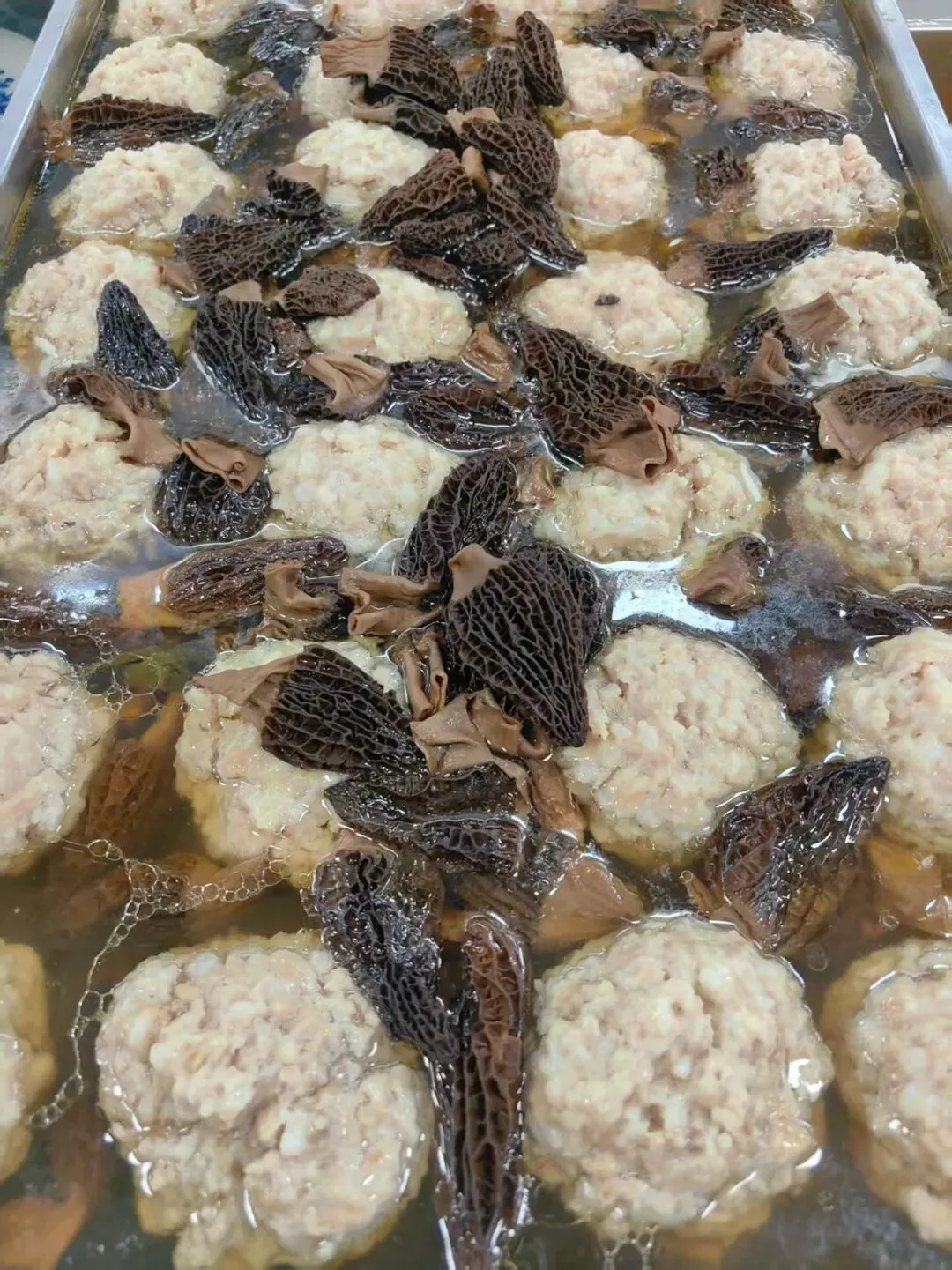 泡椒鸭胗,羊肚菌清蒸肉丸,花菜炒培根,黄瓜炒鸡蛋,平菇炒肉片,清炒黄芽白,清炒小白菜,酸辣汤。