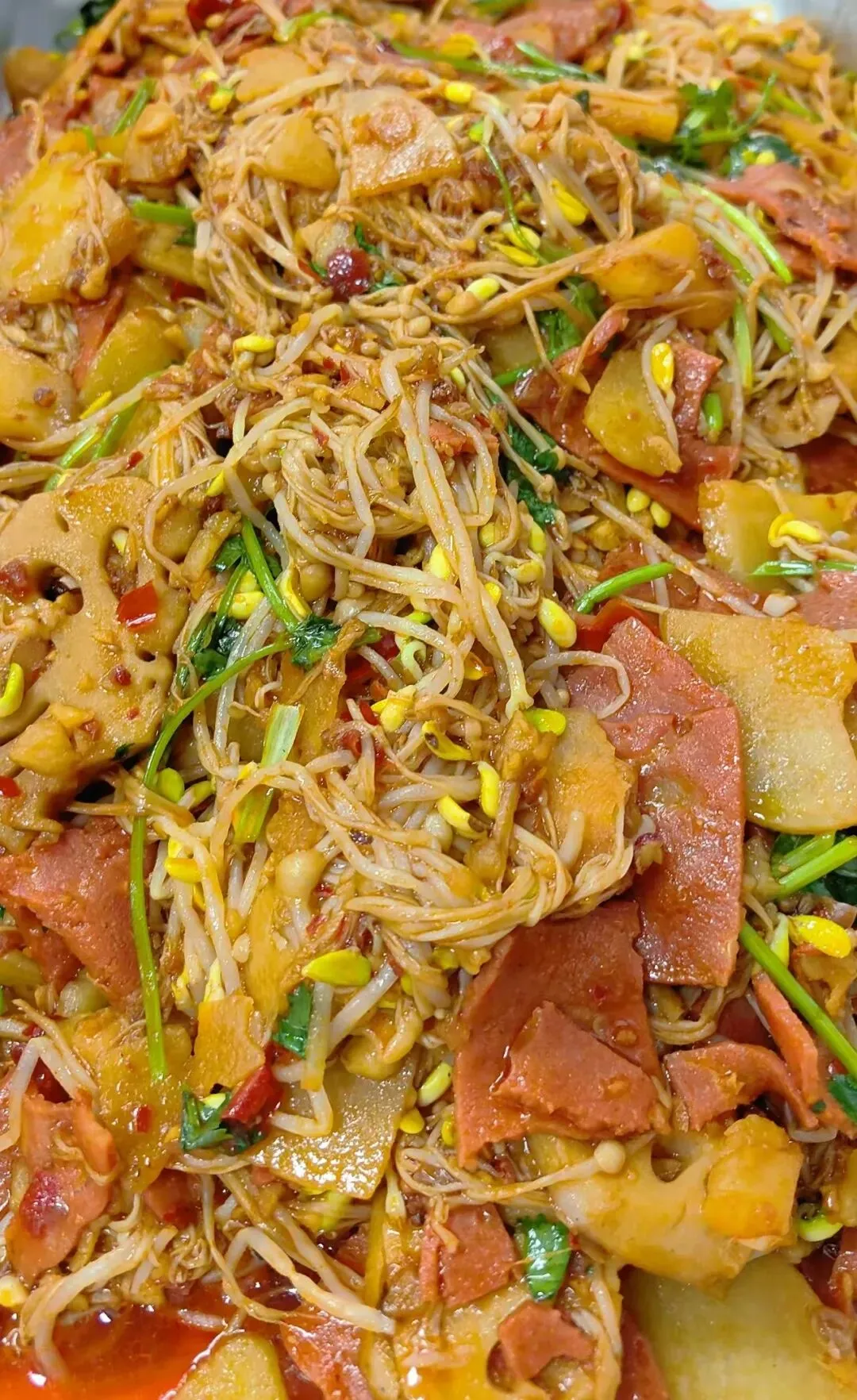 干菜烧凤爪,鹿茸菇烧排骨,麻辣香锅,西湖瓜炒肉,西红柿炒蛋,酸辣芽白秧,葱香豆芽,香菇肉丝汤。