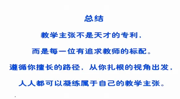 她说:“教学主张不是专家学者的专属,不是高深晦涩的理论,是教师基于长期实践与深度思考,从个人经验中提炼、经理论建构而形成的,关于“教什么、如何教、为何教”的系统性、个性化教学见解信念。