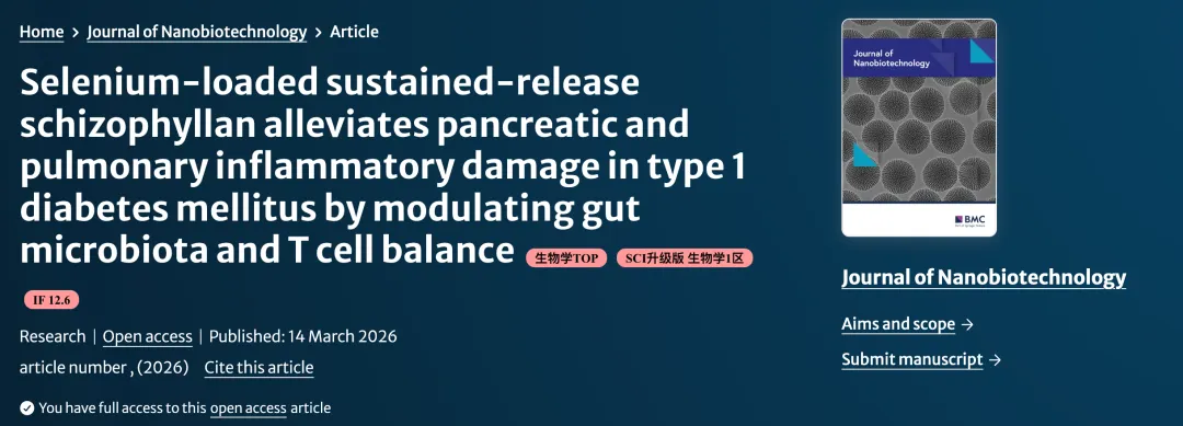 各位热爱科研的小伙伴们,今天为大家推介2026年3月14日发表在 《Journal of Nanobiotechnology》杂志的研究性文章。该文章由南昌大学第二附属医院 邹芳副主任医师等团队共同完成,主要研究方向为糖尿病、糖尿病慢性并发症、甲状腺疾病、肾上腺疾病、性腺疾病、骨质疏松症、痛风、性腺相关内分泌疑难疾病等。文章题目“Selenium-loaded sustained-release schizophyllan alleviates pancreatic and pulmonary inflammatory damage in type 1 diabetes mellitus by modulating gut microbiota and T cell balance”。本研究旨在开发一种硒负载的缓释裂褶菌多糖复合物,并探究其通过调节肠道菌群和Toll样受体4/核因子κB信号通路,从而缓解与1型糖尿病相关的炎症免疫反应的具体机制,并且围绕硒纳米颗粒、裂褶菌多糖、肠道菌群、Toll样受体4/核因子κB信号通路、免疫稳态、1型糖尿病等关键词展开研究。