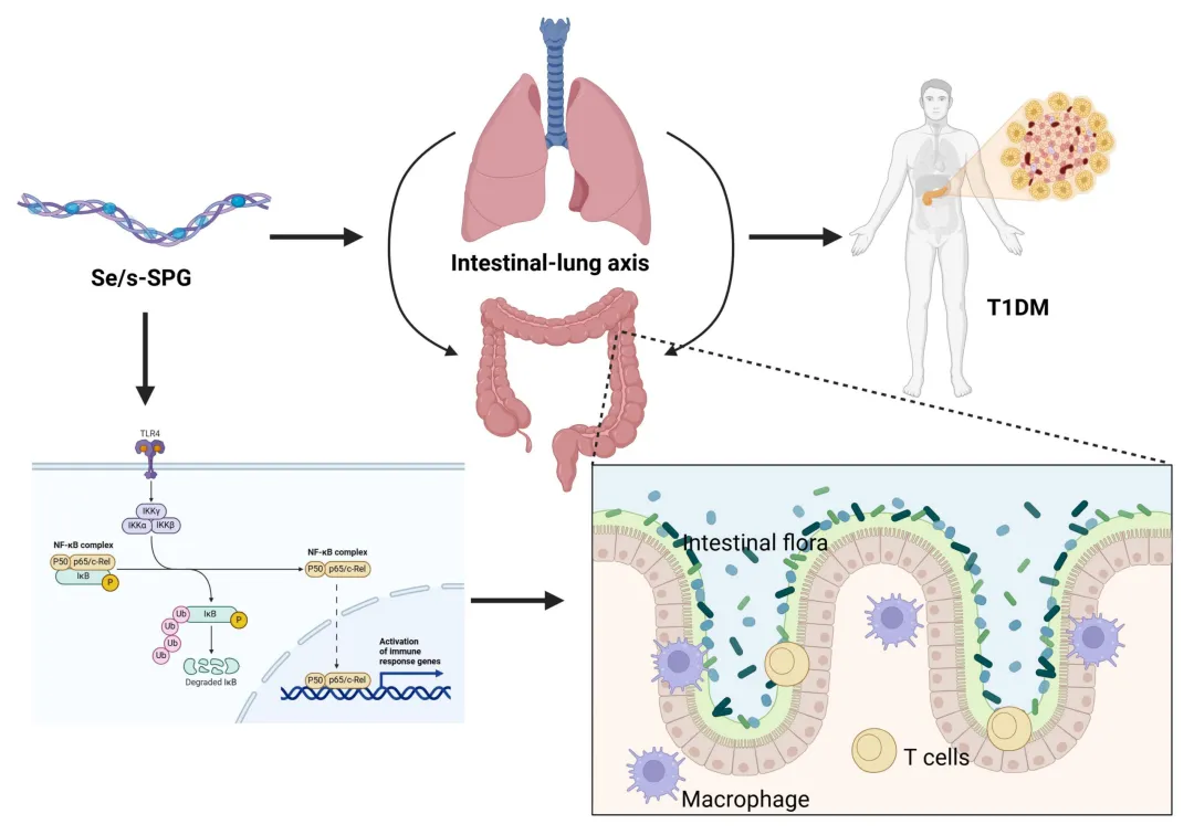结论:Se/s-SPG复合物作为一种新型纳米递送系统,能够通过调节肠道菌群和抑制TLR4/NF-κB信号通路,重塑“肠道-肺部”轴的免疫稳态,从而有效减轻1型糖尿病相关的胰腺和肺部损伤,为1型糖尿病的治疗提供了一种基于免疫-菌群调控的多靶点新策略。