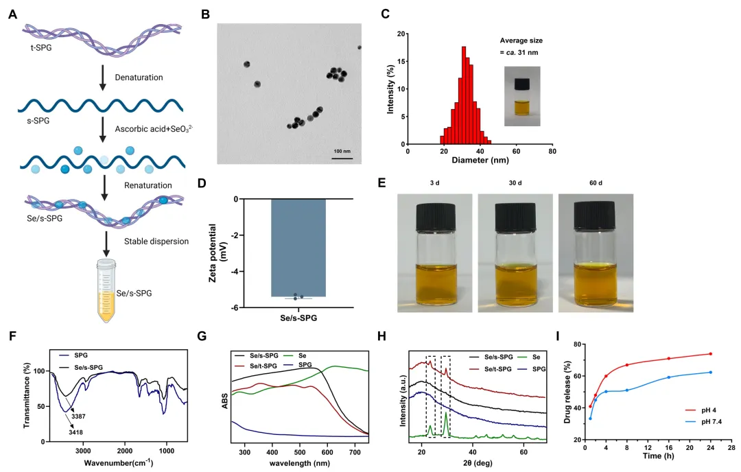 (A) Se/s-SPG合成过程示意图,展示SPG包封SeNPs的过程;(B) TEM图像,显示Se/s-SPG的形态;(C) DLS分析,显示Se/s-SPG在水溶液中的流体动力学尺寸分布;(D) Zeta电位测量,显示Se/s-SPG胶体的表面电荷特征;(E) Se/s-SPG溶液在室温避光储存3天、30天和60天后的稳定性评估;(F) FTIR分析,显示SPG与SeNPs之间的相互作用;(G) UV-Vis光谱,比较SeNPs、SPG和Se/s-SPG的吸收谱;(H) XRD分析,显示SeNPs与Se/s-SPG之间的晶体结构差异;(I) Se/s-SPG的体外释放曲线。