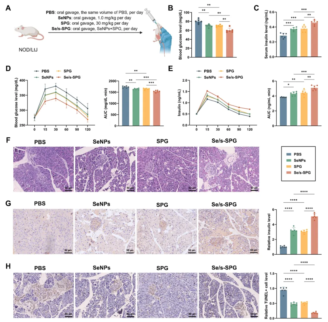 2.代谢改善: Se/s-SPG显著降低了空腹血糖,改善了糖耐量,增加了胰岛素分泌,修复了胰岛结构。