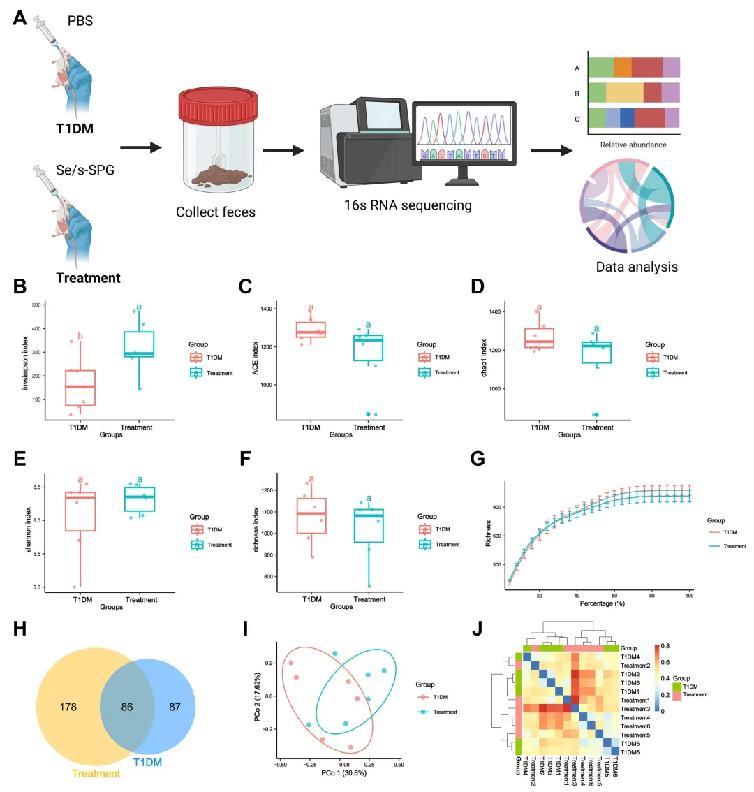 (A) T1DM组与治疗组粪便样本16S rRNA高通量测序的工作流程示意图;(B) 使用InvSimpson指数进行α多样性分析,评估微生物多样性;(C-F) 使用Shannon、Chao1、ACE和Richness指数评估微生物丰富度;(G) 稀释曲线,评估测序深度;(H) Venn图,显示组间共有及独有OTU;(I) 基于β多样性的主坐标分析,评估微生物群落结构差异;(J) Bray-Curtis距离热图,显示样本间微生物组成的相似性。