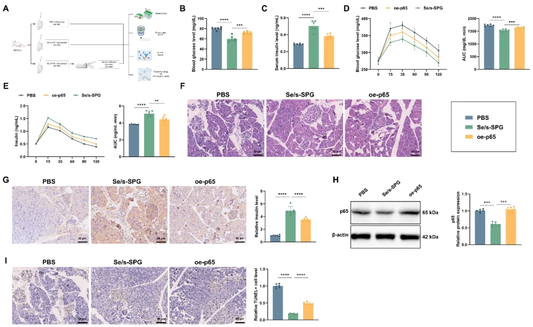 (A) 实验设计示意图,显示模型组、Se/s-SPG组及Se/s-SPG+oe-p65组的干预方案及样本处理流程;(B) 血糖仪测定的空腹血糖水平;(C) ELISA法测定的血清胰岛素浓度;(D) OGTT显示动态血糖水平随时间变化,及相应AUC分析;(E) OGTT期间ELISA测定的血清胰岛素水平,及胰岛素分泌曲线和AUC;(F) H&E染色评估胰腺组织结构和炎性细胞浸润;(G) IHC染色评估胰腺组织中胰岛素阳性细胞的分布与表达;(H) Western blot检测胰腺组织中p65表达及定量分析;(I) TUNEL染色检测胰腺组织中凋亡细胞数量。