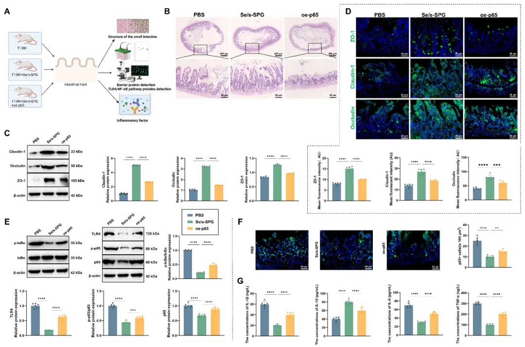 (A) T1DM组、Se/s-SPG组及Se/s-SPG+p65过表达组小肠组织处理流程示意图;(B) H&E染色显示小肠绒毛形态及炎性细胞浸润;(C) Western blot检测肠道组织中屏障相关蛋白ZO-1、Occludin和Claudin-1的表达;(D) 免疫荧光检测ZO-1、Occludin和Claudin-1在肠上皮界面的定位与表达;(E) Western blot检测小肠组织中TLR4、磷酸化p65、p65及磷酸化IκBα蛋白水平;(F) 免疫荧光分析p65核转位,评估NF-κB通路激活状态;(G) ELISA检测肠道组织中促炎细胞因子(IL-6、TNF-α、IL-1β)及抗炎细胞因子IL-10水平。