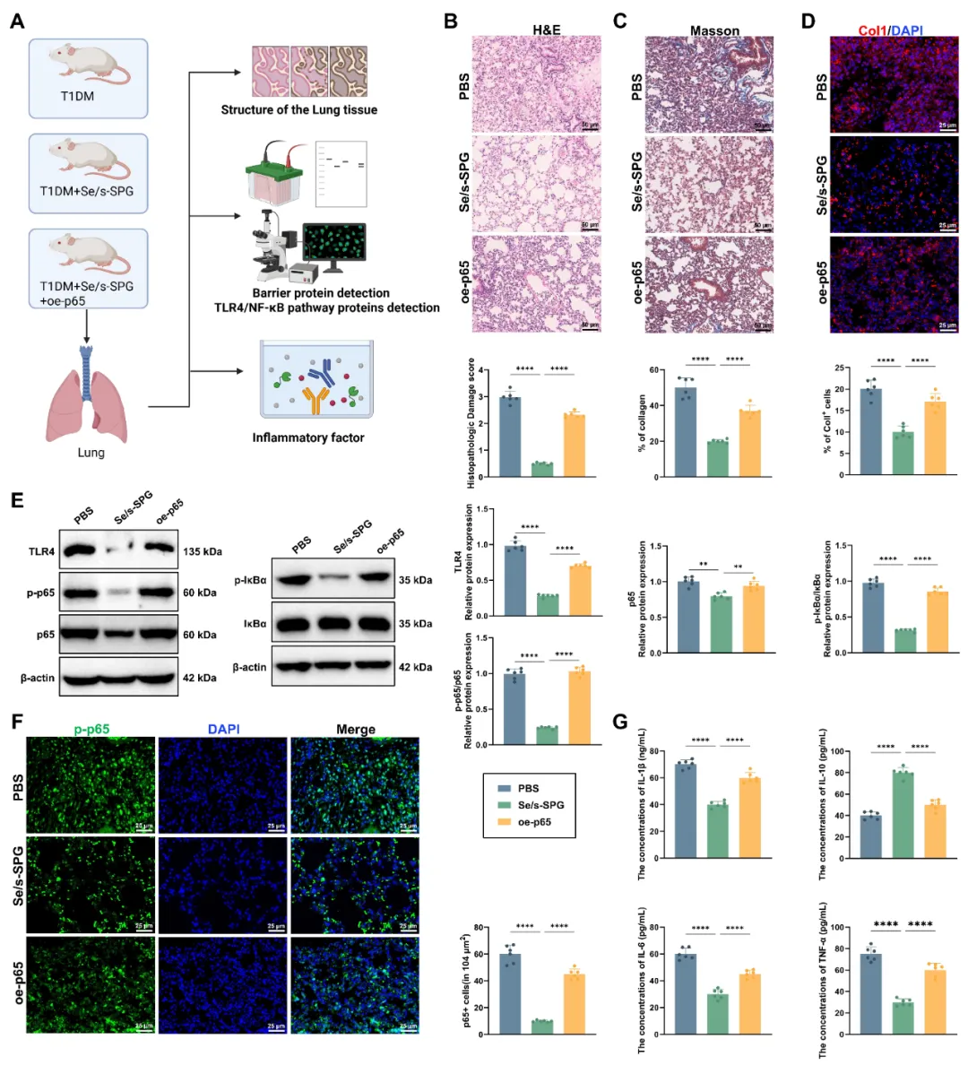 (A) 实验设计示意图,显示模型组、Se/s-SPG组及Se/s-SPG+p65过表达组肺组织处理流程;(B) H&E染色显示肺泡结构、间质增生及炎性细胞浸润;(C) Masson三色染色评估肺组织胶原沉积,蓝色区域代表胶原纤维;(D) 免疫荧光检测肺组织中胶原蛋白I的表达与空间分布;