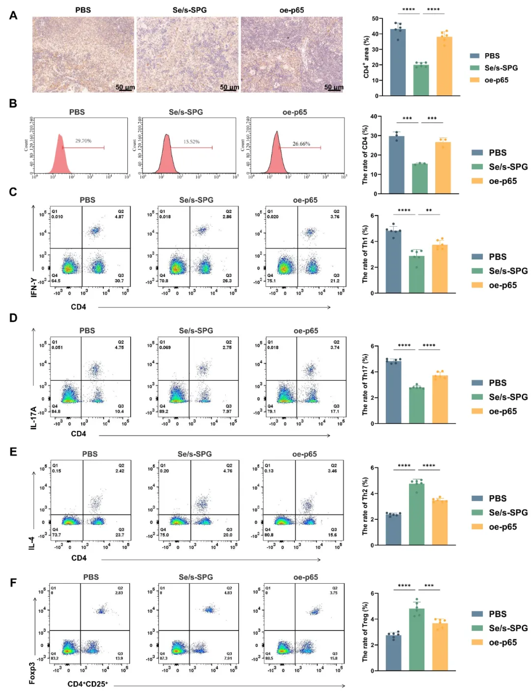 (A) 小鼠脾脏组织IHC染色,显示CD4+细胞的分布与表达水平;(B) 流式细胞术分析各组脾脏单个核细胞中CD4+ T细胞的总体比例;(C) 流式细胞术分析Th1细胞;(D) 流式细胞术分析Th2细胞;(E) 流式细胞术分析Th17细胞;(F) 流式细胞术分析Treg细胞。