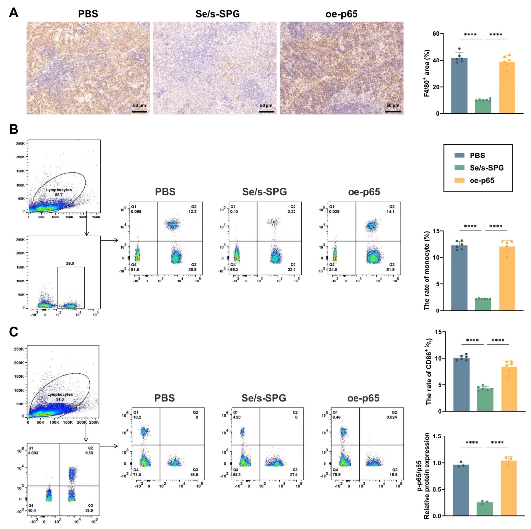 (A) 各组小鼠脾脏组织F4/80 IHC染色,评估巨噬细胞浸润情况;(B) 流式细胞术分析脾脏中单核细胞群;(C) 流式细胞术定量分析脾脏中CD86+(M1型)和CD206+(M2型)巨噬细胞的比例。