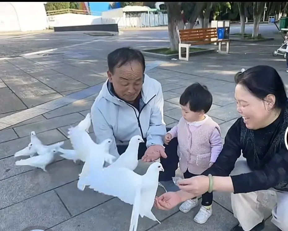 雪白的鸽子在身边盘旋、起落,翅膀轻扇,伴着清脆的咕咕声。一家人围在一起投喂、说笑,简单的快乐,在这一刻格外动人。