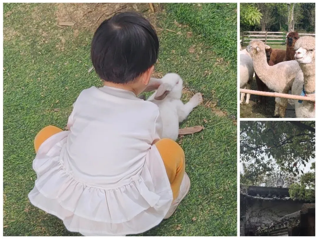 旁边的小兔子蹦蹦跳跳,长耳朵、圆身子,可爱到让人移不开眼。孩子们蹲在一旁,看着它们吃草、打闹,笑声不断。