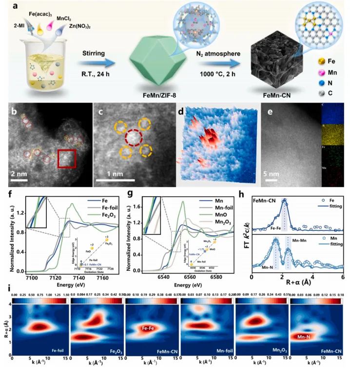 (a)FeMn-CN制备过程示意图。(b,c)交流 HAADF -STEM图像。(d)(c)中选定区域的三维原子重叠表面图。(e) HAADF -STEM图像及对应元素分布图。(f,g)Fe和MnK边 XANES 。(h)Fe和MnK边 EXAFS 拟合曲线。(i)FeMn-CN与标准样品的重量百分比(WT)。不同污染物的降解试验结果一致。详细计算方法见补充文本S5–7。