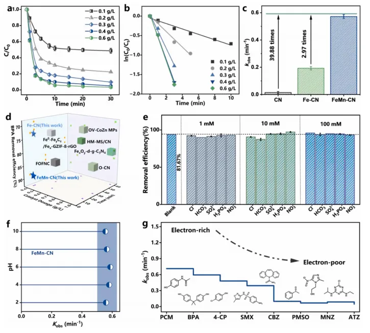 (a) 不同剂量对FeMn-CN自维持水净化系统的影响及(b) 对应的准一级动力学拟合结果(初始反应条件:催化剂浓度0.1–0.6 g L−1,BPA浓度10 mg L−1,pH=7,25°C)。(c) 三种催化剂基自维持水净化系统对BPA的去除率。(d) 不同自维持水净化系统的催化剂用量与去除效率。(e) 不同浓度碱性离子对FeMn-CN系统反应速率的影响。(f) pH对FeMn-CN系统反应速率的影响。(g) FeMn-CN系统中不同有机污染物的K值。
