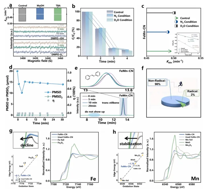 (a) MeOH和TBA对FeMn-CN体系中BPA降解速率的影响,以及FeMn-CN体系中自由基·OH和O2−·的EPR谱图(初始反应条件:催化剂0.4 g L−1,BPA 10 mg L−1,MeOH和TBA=200 mM, DMPO =200 mM,pH=7,25°C)。(b) FeMn-CN在N2气氛和D2O条件下对BPA的C/C0值。(c) FeMn-CN在N2气氛和D2O条件下BPA降解速率的比较。插图显示了这些条件下BPA降解的相应准一级动力学拟合。(d) FeMn-CN体系中 PMSO 的消耗及PMSO2的生成。(初始反应条件:催化剂0.4 g L−1,BPA 10 mg L−1, PMSO 20 mM,pH=7,25°C)。(e) 使用反式芪作为探针验证FeMn-CN体系中高价金属的存在。(f) 自由基与非自由基途径的贡献。(g,h) FeMn-CN自维持水净化系统中反应前后Fe和Mn价态变化的同步辐射分析。