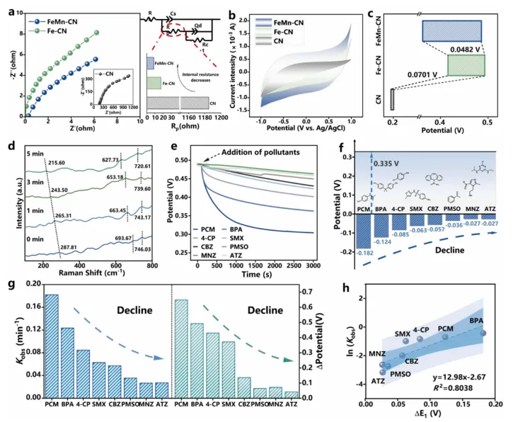 (a)三种材料的电化学阻抗对比分析。(b)三种材料的循环伏安曲线。(c)添加BPA后三种材料的 OCP 变化。(d)AOP工艺过程中催化剂生成的原位/操作态拉曼光谱。(e)FeMn-CN自维持净水系统添加不同污染物后的 OCP 变化。(f)其他污染物添加对FeMn-CN体系 OCP 的影响。(g)两种体系的kobs值与 OCP 对比分析。(h)ln(kobs)与电位变化之间的线性相关性。