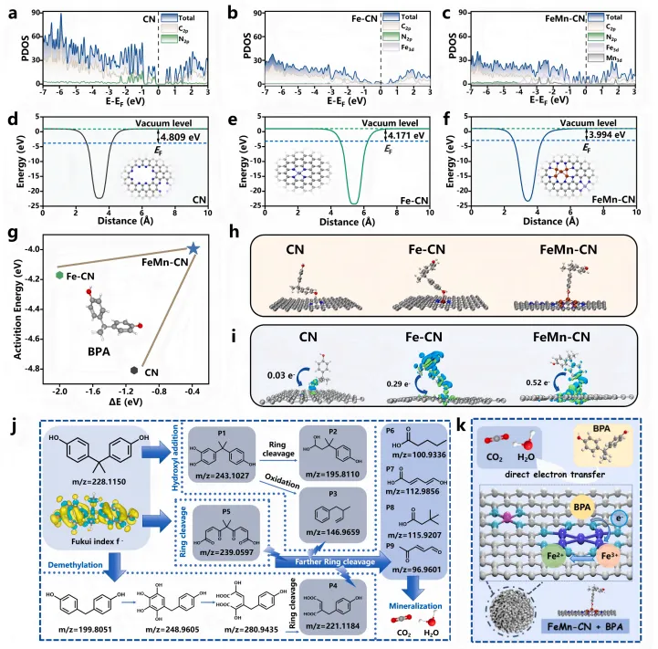 (a-c) CN、Fe-CN、FeMn-CN的 PDOS ;(d-e) CN、Fe-CN、FeMn-CN的工作函数;(g) d键中心能量与BPA(-OH)吸附氧原子DFT计算吸附能的火山图;(h) Fe-CN与FeMn-CN催化剂对BPA吸附能的对比分析;(i) 不同催化剂上吸附BPA的电荷差密度分布及电子转移数分析(绿色表示电子捕获能力,蓝色表示电子供给能力);(j) FeMnCN体系中BPA可能的降解路径;(k) FeMn-CN体系的反应机理示意图。