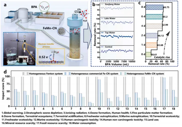 (a) FeMn-CN系统反应器示意图。插图显示用于降解FeMn-CN系统中BPA的流化床装置(BPA浓度为0.4 mg·L−1)。(b) FeMn-CN自维持水净化系统在流化床设备中对不同水基质(不同水基质=10,000 mL,流速=2.5 ml/min,运行时间=66.6小时)中BPA的去除效果。(c) FeMn-CN活性恢复情况监测。(d) LCA中FeMn-CN系统、Fe-CN系统及均相Fenton系统各描述符的影响评分。