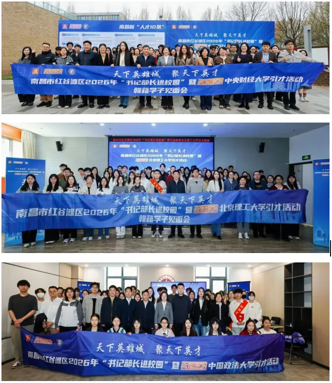 为落实中央人才工作会议及南昌市相关部署,紧扣“每年吸引10万大学生和技能人才来昌留昌”目标,4月9日-4月10日,南昌市红谷滩区2026年“书记部长进校园”暨“百场校招”引才活动在中央财经大学、北京理工大学、中国政法大学圆满举办。