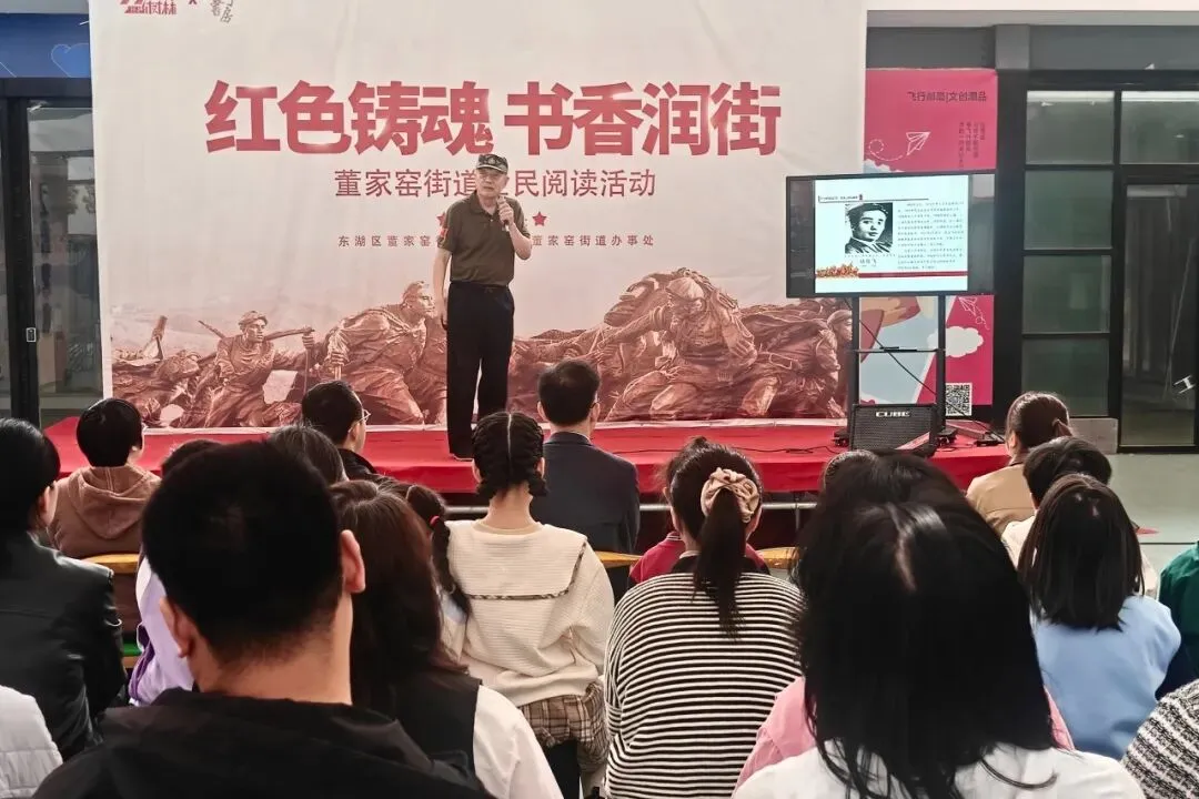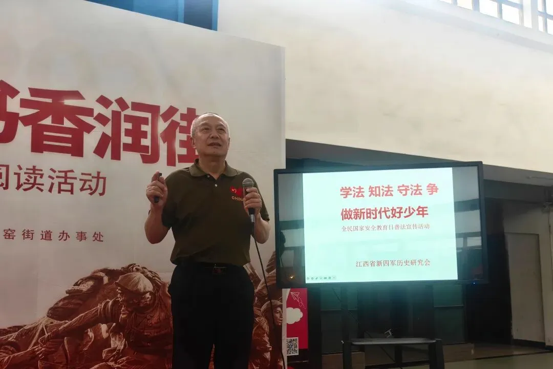 4月12日上午,江西省新四军历史研究会宣讲团走进99樟树林文创园,深度参与由南昌市东湖区董家窑街道党工委、董家窑街道办事处主办,99樟树林文创园、孺子书房樟树林分馆协办的“红色铸魂 书香润街”全民阅读主题活动。100余名党员、学生及居民代表齐聚现场,在品读红色经典、聆听革命故事中筑牢信仰根基,在国家安全法治宣传中提升安全防范意识,共同开启了一场融合书香文化、红色教育与普法宣传的特色文化活动。