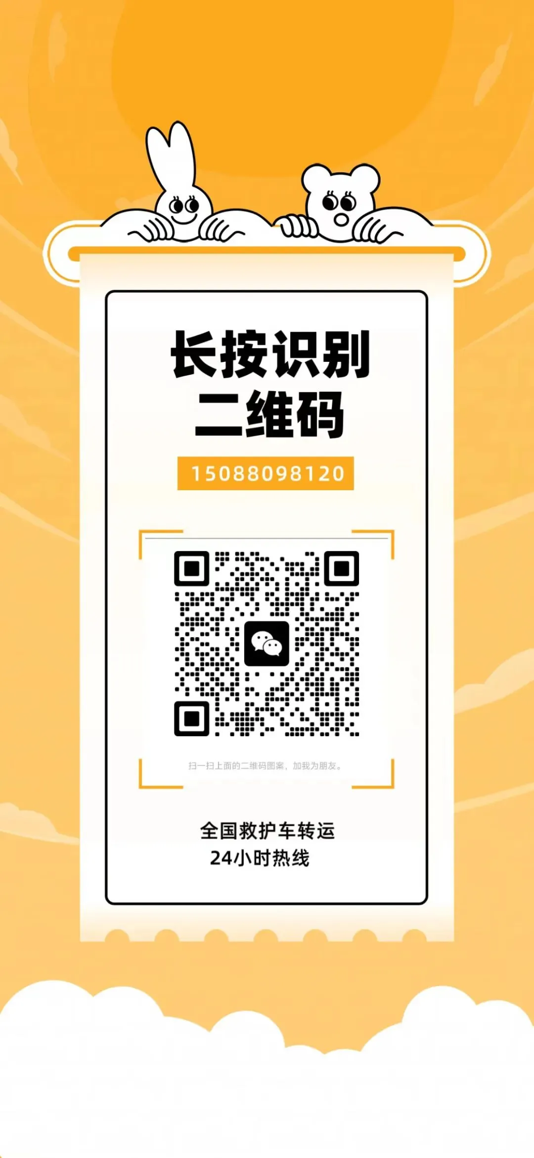 微信客服:15088098120(←长按复制,添加微信咨询)120急救救护车:《院前医疗急救管理办法》严格监管,必须由120急救中心统一调度,不得私自运营,病人出现紧急情况→立即拨打120。