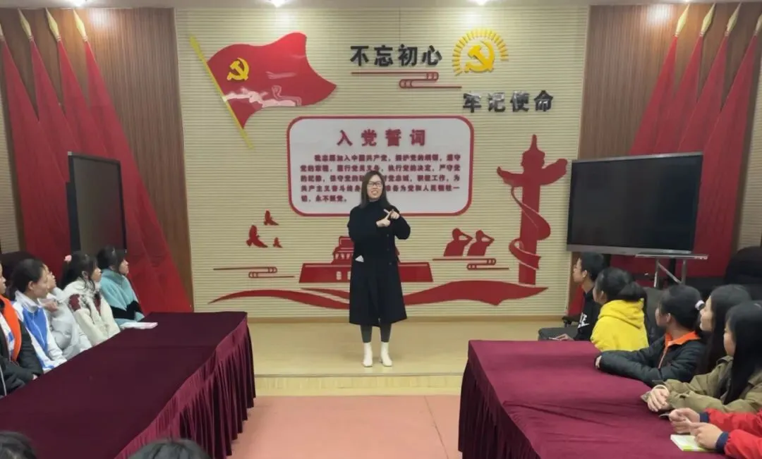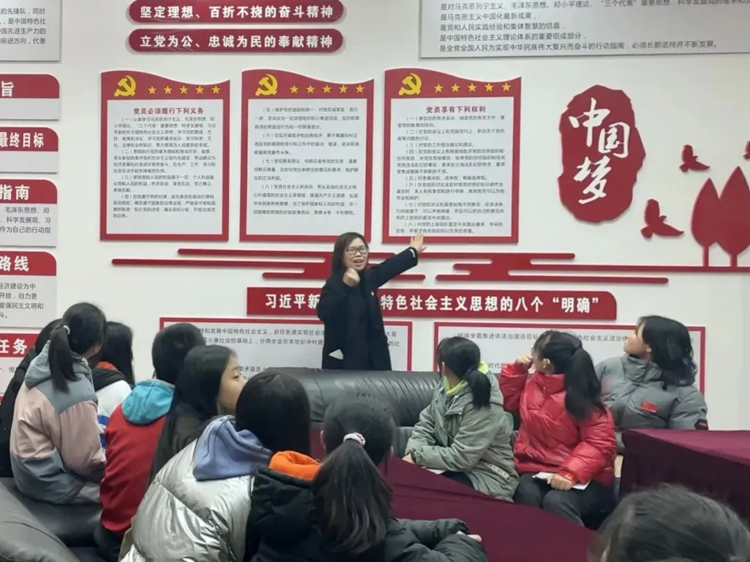 孙丽萍老师告诉大家,党建教育基地是学校党支部的主要文化阵地,用于党支部开展各类活动。她根据基地各区域展示的《中国共产党章程》部分内容、习近平新时代中国特色社会主义思想等基本内容,以及设立学校党支部的情况、党员风采等特色专栏进行了详细解说。