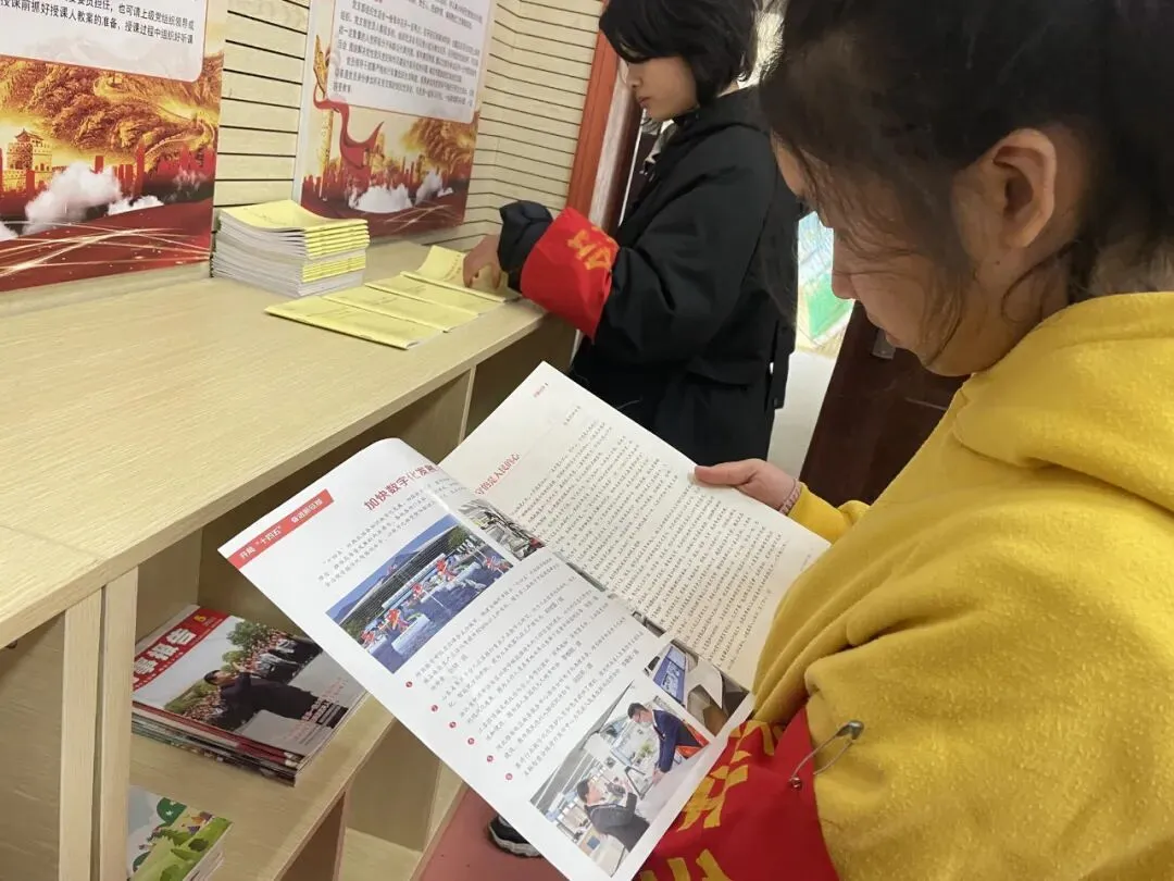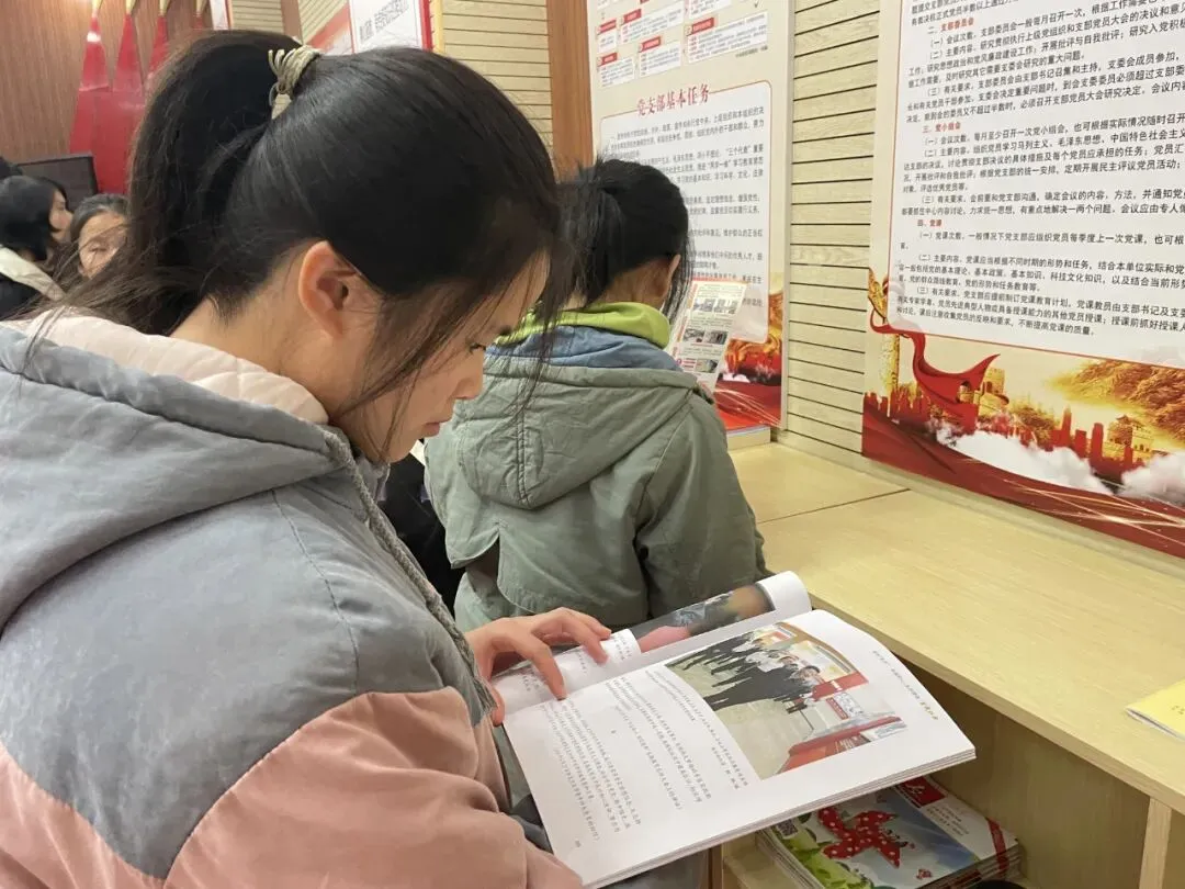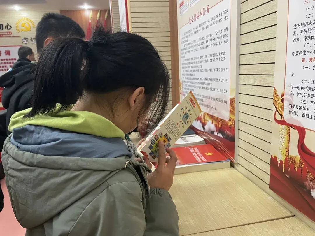 团员学生们一边参观一边聆听讲解,还兴趣十足地拿起党建学习书籍进行阅读,互相探讨学习。