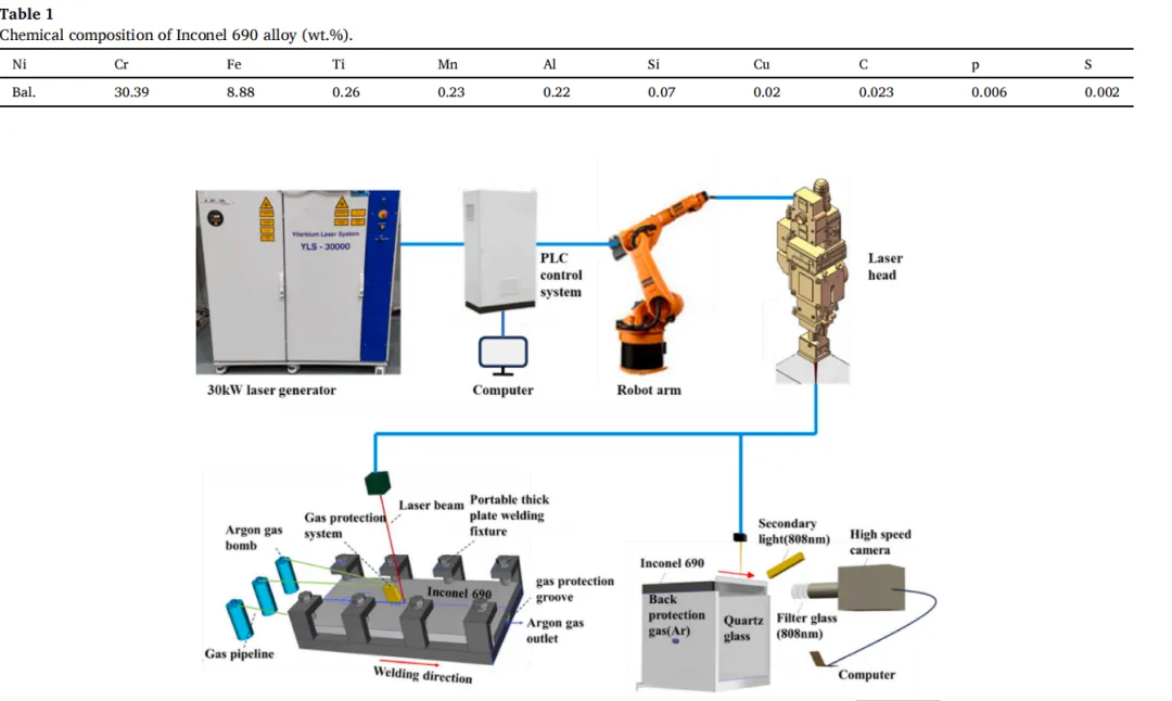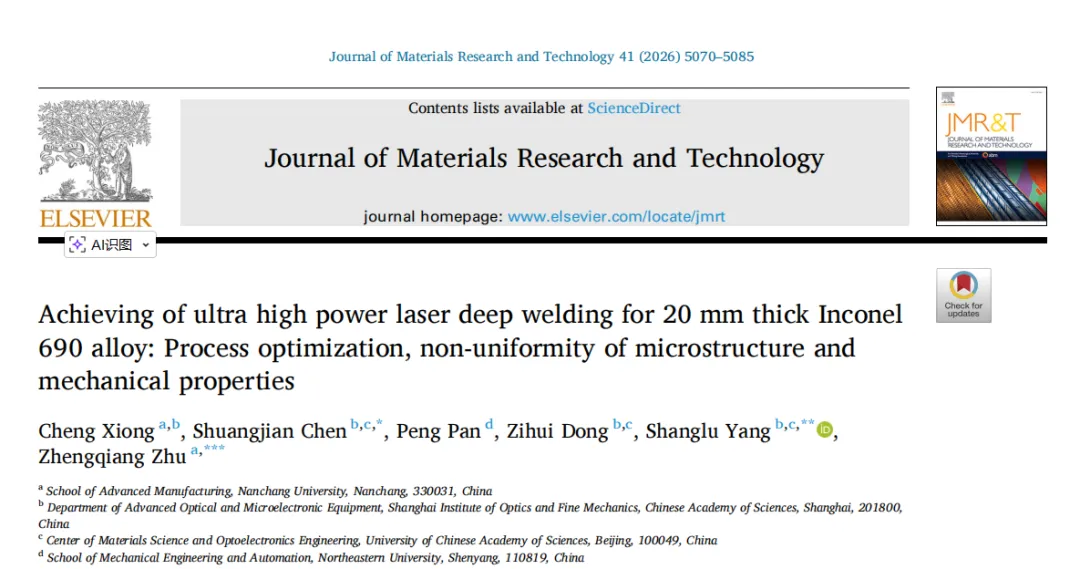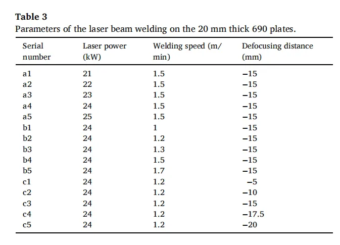 在本研究中,首次采用30千瓦超高功率激光束焊接,在氩气保护环境下实现了20毫米厚Inconel 690合金的单道自熔焊接,证明了超高功率激光束焊接对于大厚度Inconel 690的可行性。主要结论如下: