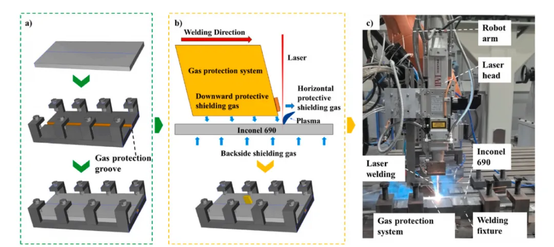 图2. 厚板焊接准备及工艺流程。a) 厚板夹持工艺;b) 前后保护气体装置;c) 厚板30 kW激光焊接工艺。