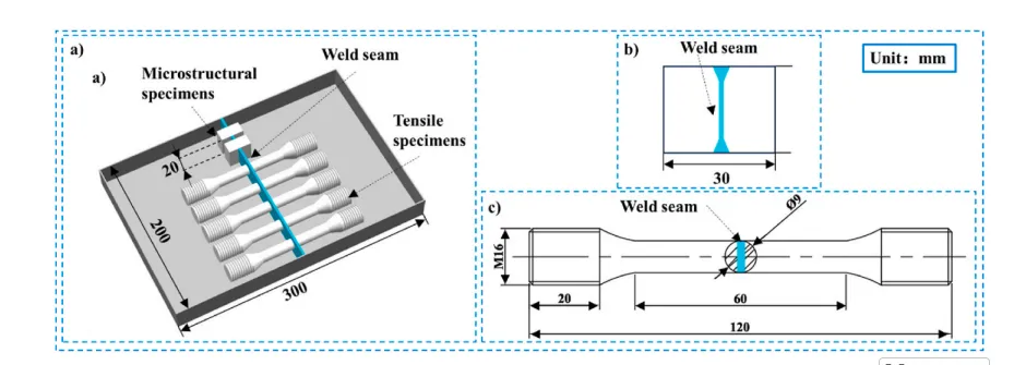 图3. 微观结构与拉伸试样。a) 采样位置;b) 微观结构试样规格;c) 拉伸试样规格。