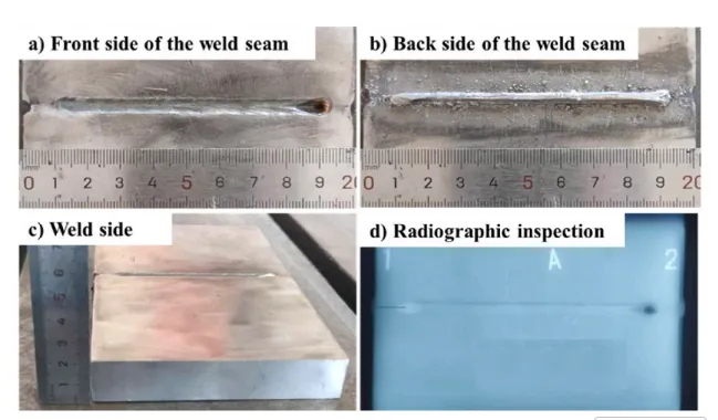 图7. 焊接形态与无损检测结果。a) 焊缝正面;b) 焊缝背面;c) 焊接面;d) 放射线检测。