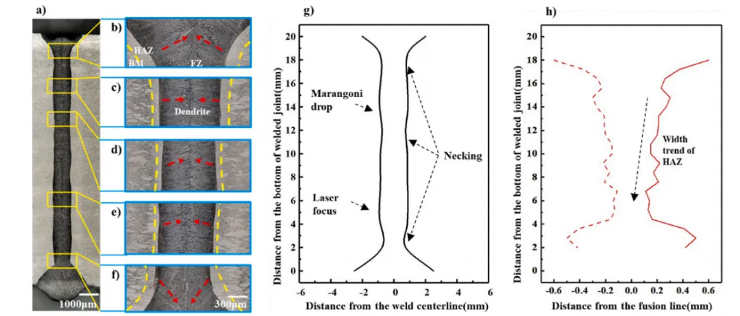 图9. 焊接接头宏观形貌及焊缝宽度统计分析。a) 焊接接头横截面金相显微图像,显示焊缝背面不同熔深区域:b) Z=17-18 mm区域;c) Z=14-15 mm区域;d) Z=7-8 mm区域;e) Z=4-5 mm区域;f) Z=1-2 mm区域;g) 焊缝前沿(FZ)宽度统计;h) 单侧热影响区(HAZ)宽度统计。