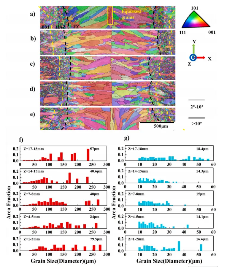 图10. 焊接接头不同深度处的晶粒特征对比:a) Z=17-18 mm区域;b) Z=14-15 mm区域;c) Z=7-8 mm区域;d) Z=4-5 mm区域;e) Z=1-2 mm区域;f) FZ区不同深度焊接接头的晶粒尺寸分布统计;g) HAZ区不同深度焊接接头的晶粒尺寸分布统计。